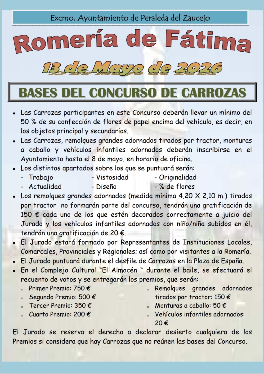 A continuación se adjunta cartel y documento con toda la información de las Bases del Concurso de Carrozas interesadas en participar en el concurso de la Romería 2026.En el cartel se puede obser(...)