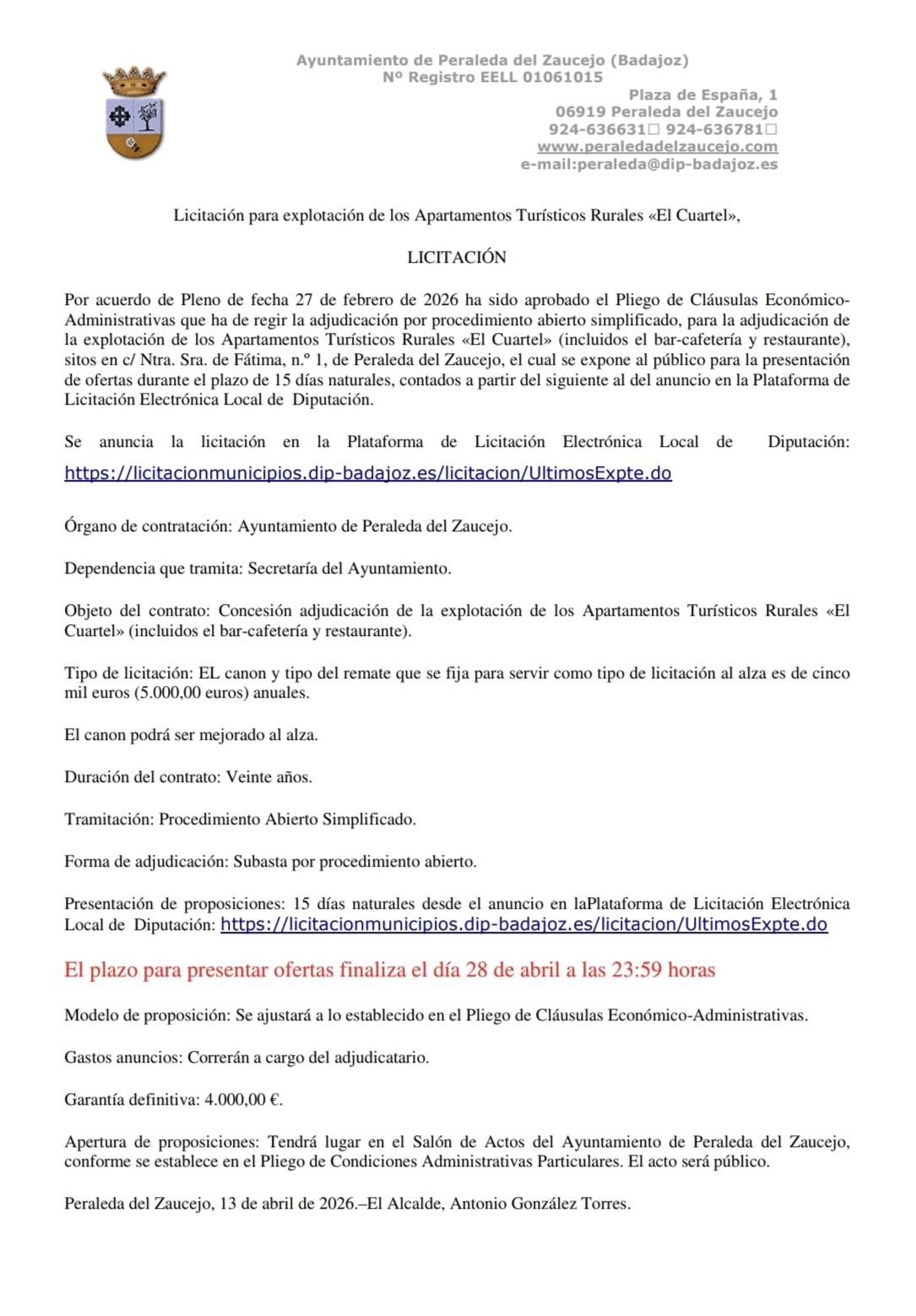 Por acuerdo de Pleno de fecha 27 de febrero de 2026 ha sido aprobado el Pliego de Cláusulas Económico Administrativas que ha de regir la adjudicación por procedimiento abierto simplificado, para la adjudicación de la explotación de los Apartamentos Turíst(...)