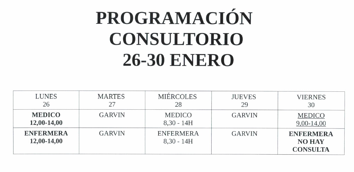 Se adjunta programación y horarios para la consulta médica y de enfermería durante la semana del 26 al 30 de enero.