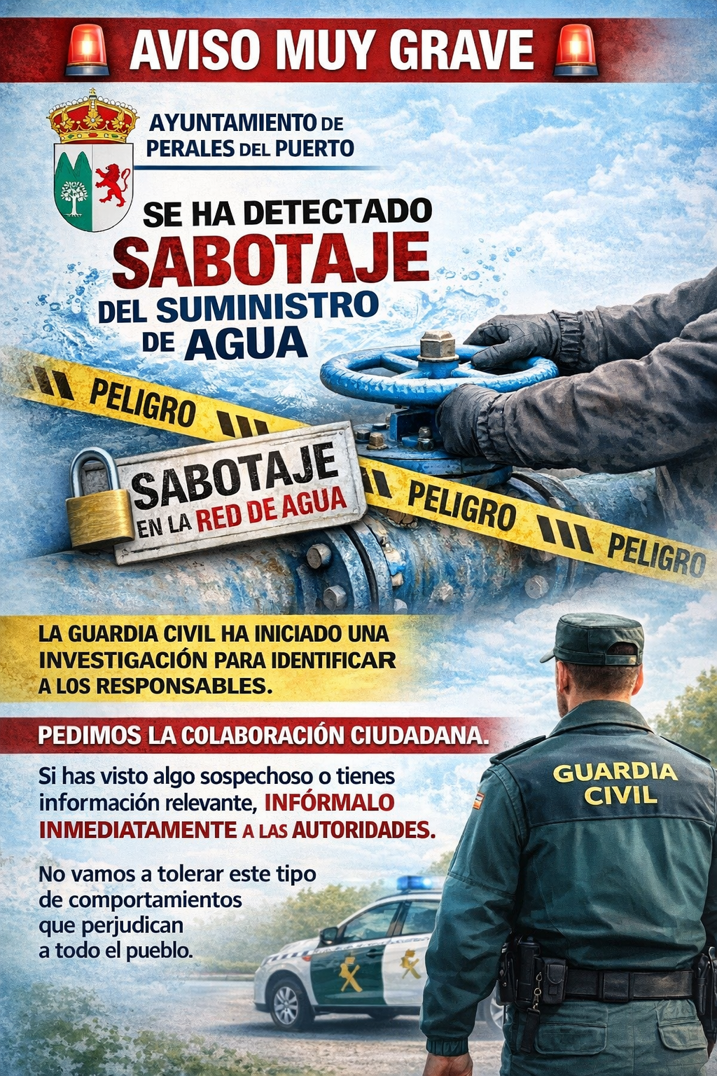 Durante la última semana se están produciendo averías continuadas en la red de abastecimiento de agua que, tras las comprobaciones realizadas, no responden a fallos fortuitos. Se ha constatado la manipulación intencionada de las llaves de corte que suministran agua al municipio, provocando cortes y daños en un servicio esencial para todos.