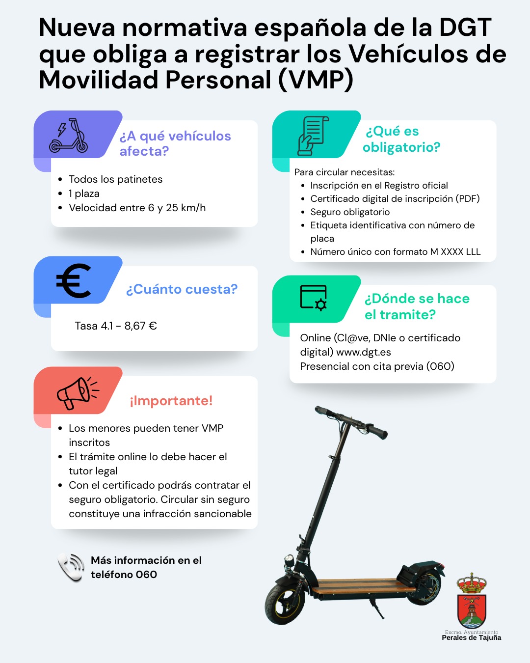 La Dirección General de Tráfico (DGT) ha puesto en marcha el Registro de Vehículos de Movilidad Personal (VMP), que obliga a inscribir todos los patinetes en el Registro Nacional de Vehículos y a contar con seguro obligatorio para poder circular legalmente. Circular sin seguro puede conllevar multas.