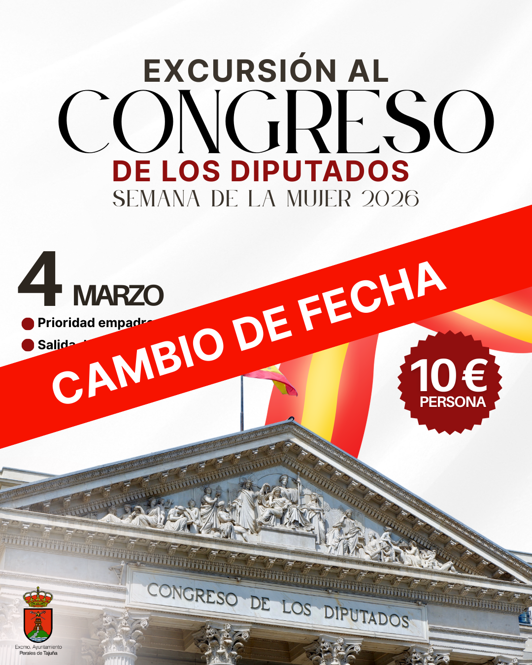 Por motivos de cambio de agenda en el Congreso de los Diputados, debido a la organización de un acto con motivo del Día de la Mujer, la excursión programada para el 4 de marzo se pospone al 5 de marzo a las 11:00 horas.