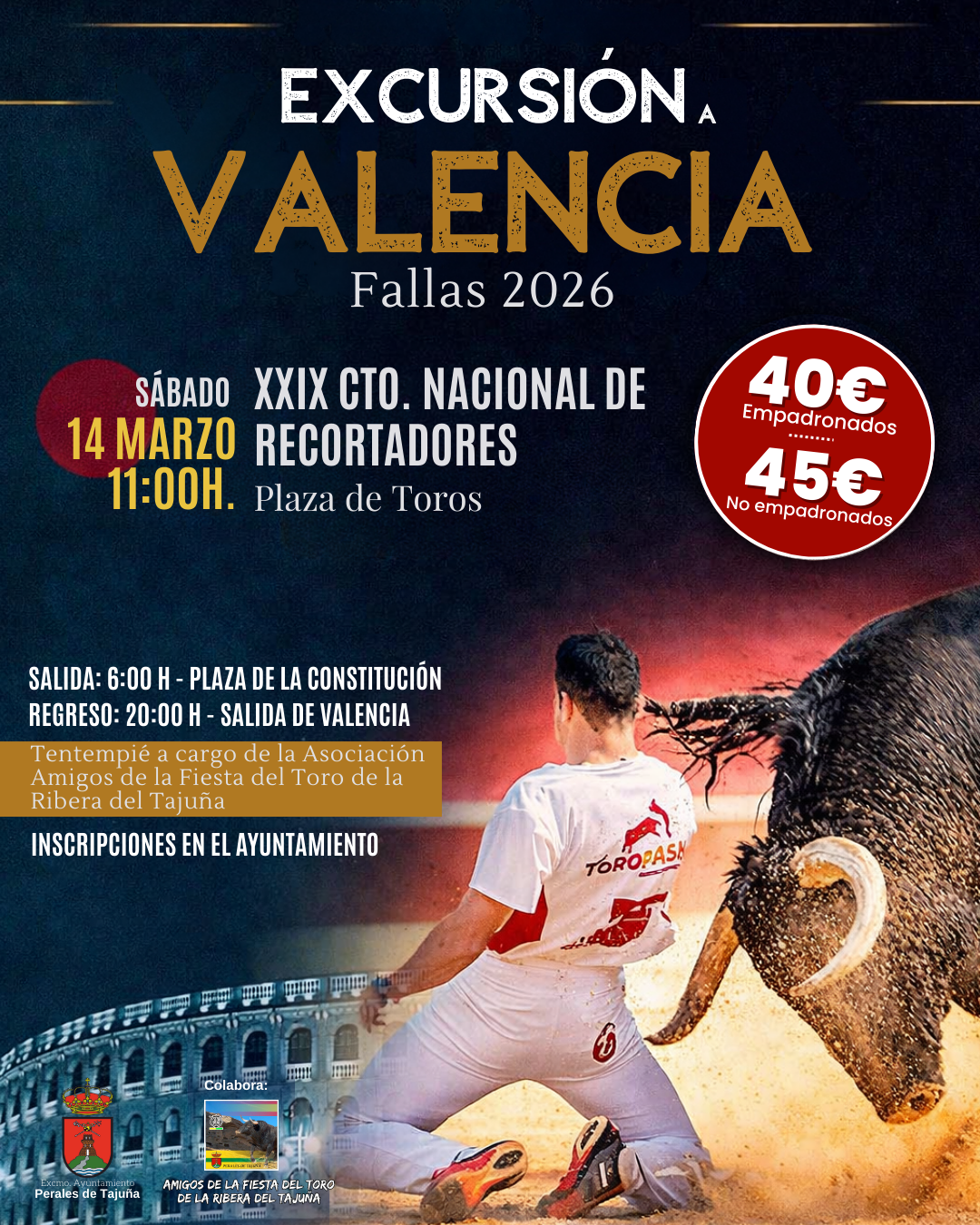 ¡Vive en directo la emoción del XXIX Campeonato Nacional de Recortadores en la Plaza de Toros de Valencia! El Ayuntamiento de Perales de Tajuña ha organizado una excursión, que tendrá lugar el próximo 14 de marzo, para disfrutar de uno de los eventos taurinos más importantes del calendario ¡No te lo pierdas!