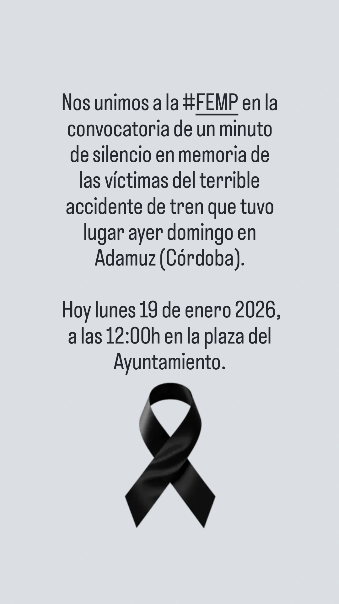 Desde nuestro ayuntamiento comunicamos que nos hemos unimos a la #FEMP en la convocatoria de un minuto de silencio en memoria de las víctimas del terrible accidente de tren que tuvo lugar ayer domingo en Adamuz (Córdoba).