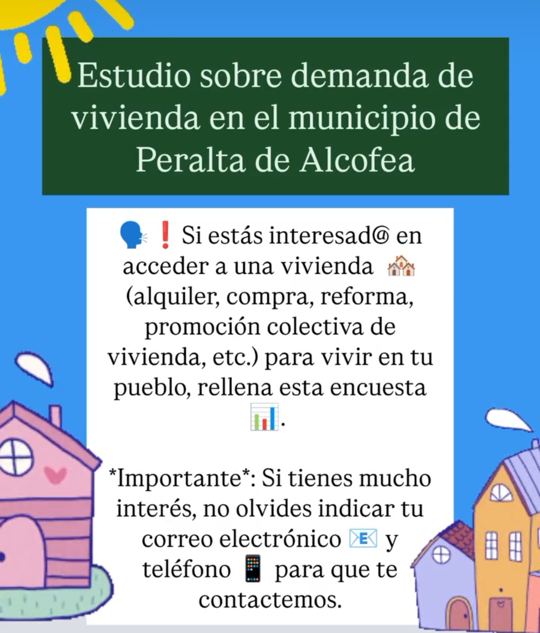 🗣️❗Si estás interesad@ en acceder a una vivienda 🏘️ (alquiler, compra, reforma, promoción colectiva de vivienda, etc.) para vivir en tu pueblo, rellena esta encuesta 📊.