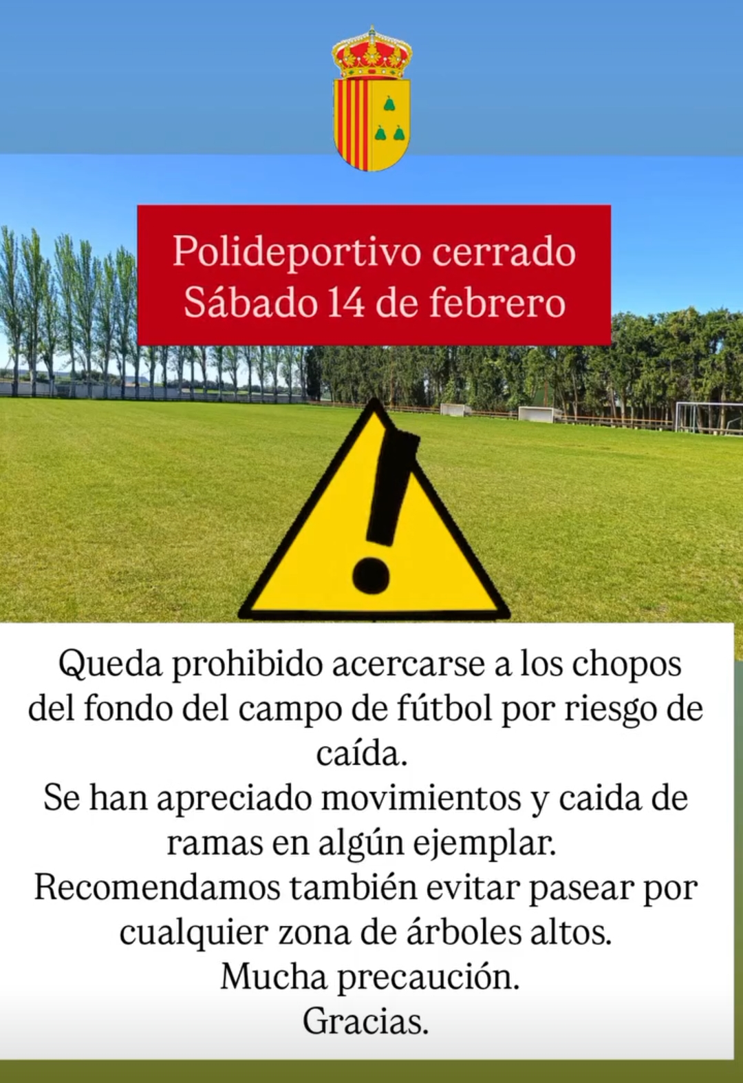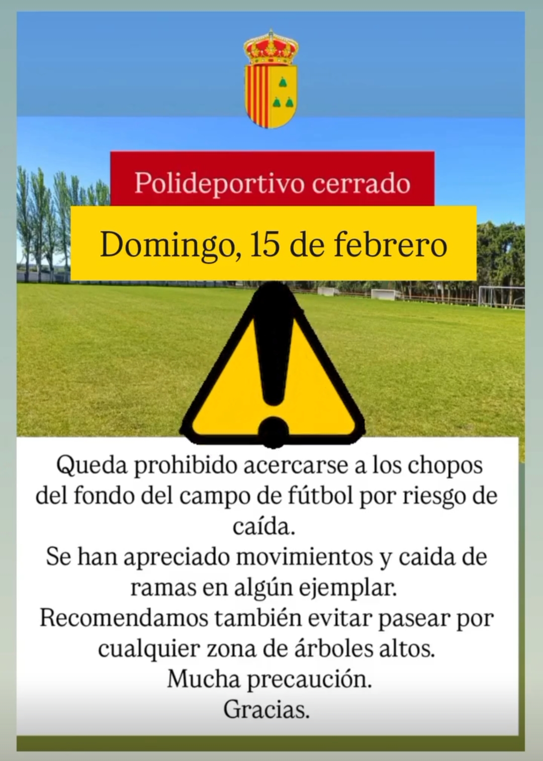 Así mismo, queda prohibido acercarse a los chopos del fondo del campo de fútbol por riesgo de caída.