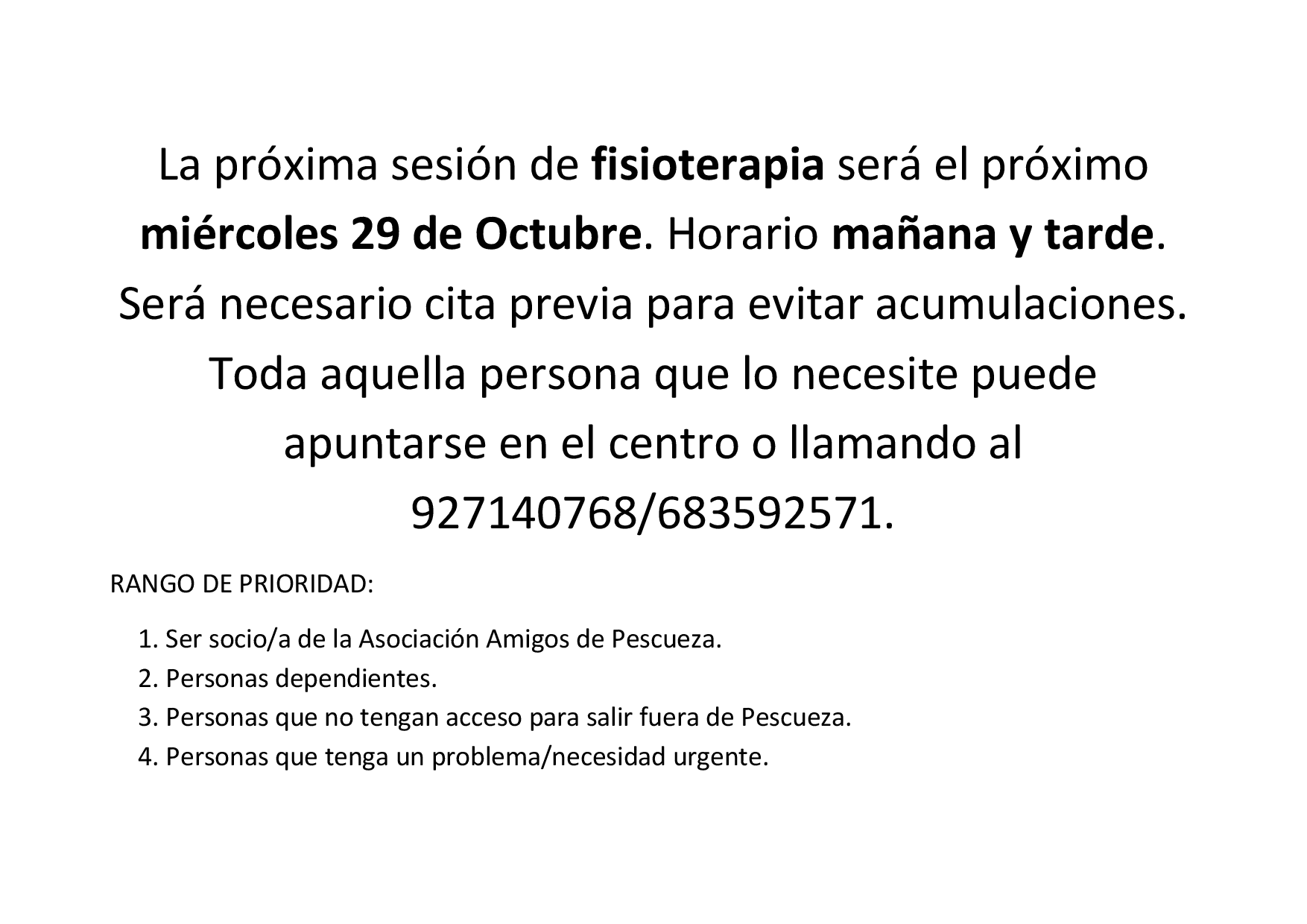 La próxima sesión de fisioterapia será el próximo miércoles 29 de octubre, en horario de mañana y tarde. Será necesaria cita previa para evitar acumulaciones. Toda aquella persona que lo necesite puede apuntarse en el centro o llamando al 927140768 / 683592571.