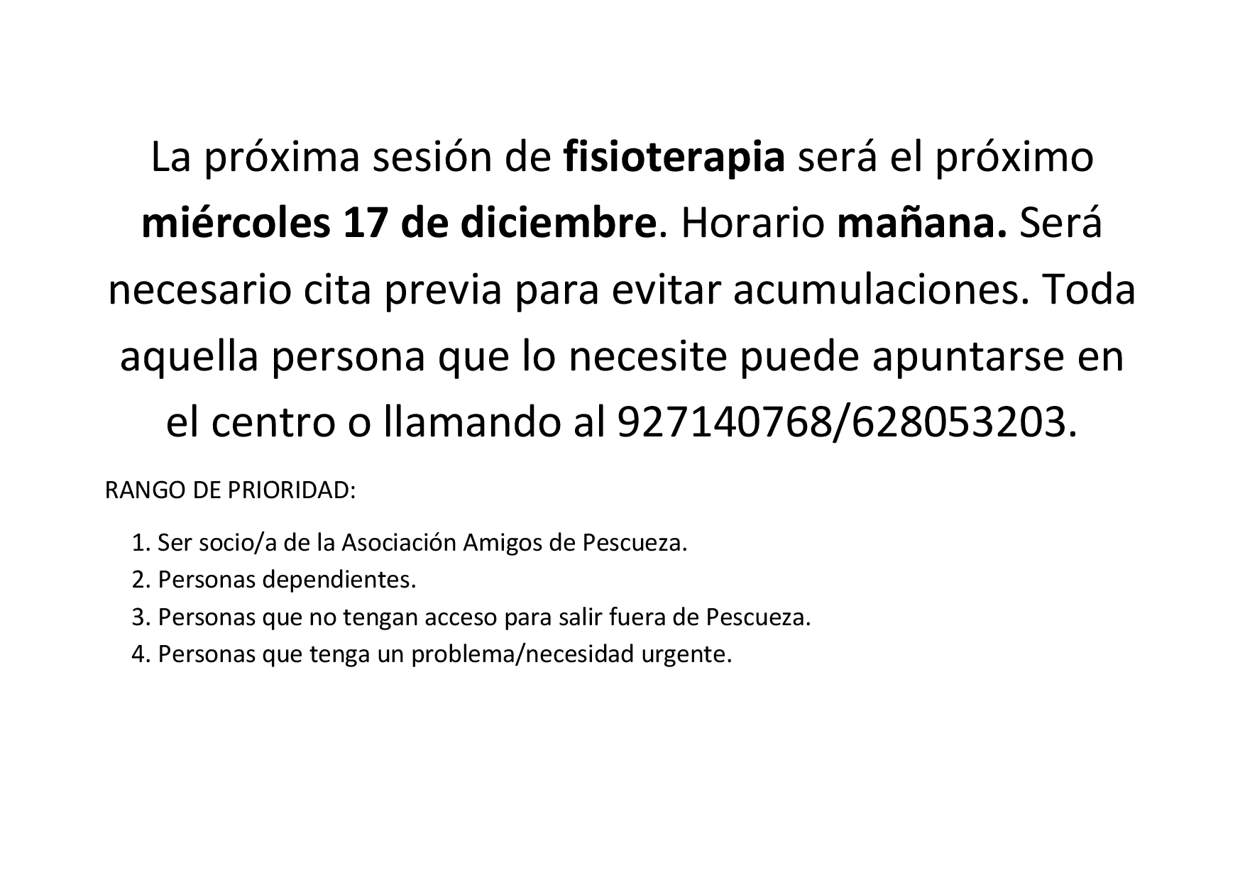 La próxima sesión de fisioterapia será el próximo miércoles 17 de diciembre. Horario de mañana. Será necesaria cita previa para evitar acumulaciones. Toda aquella persona que lo necesite puede apuntarse en el centro o llamando al 927140768/628053203.