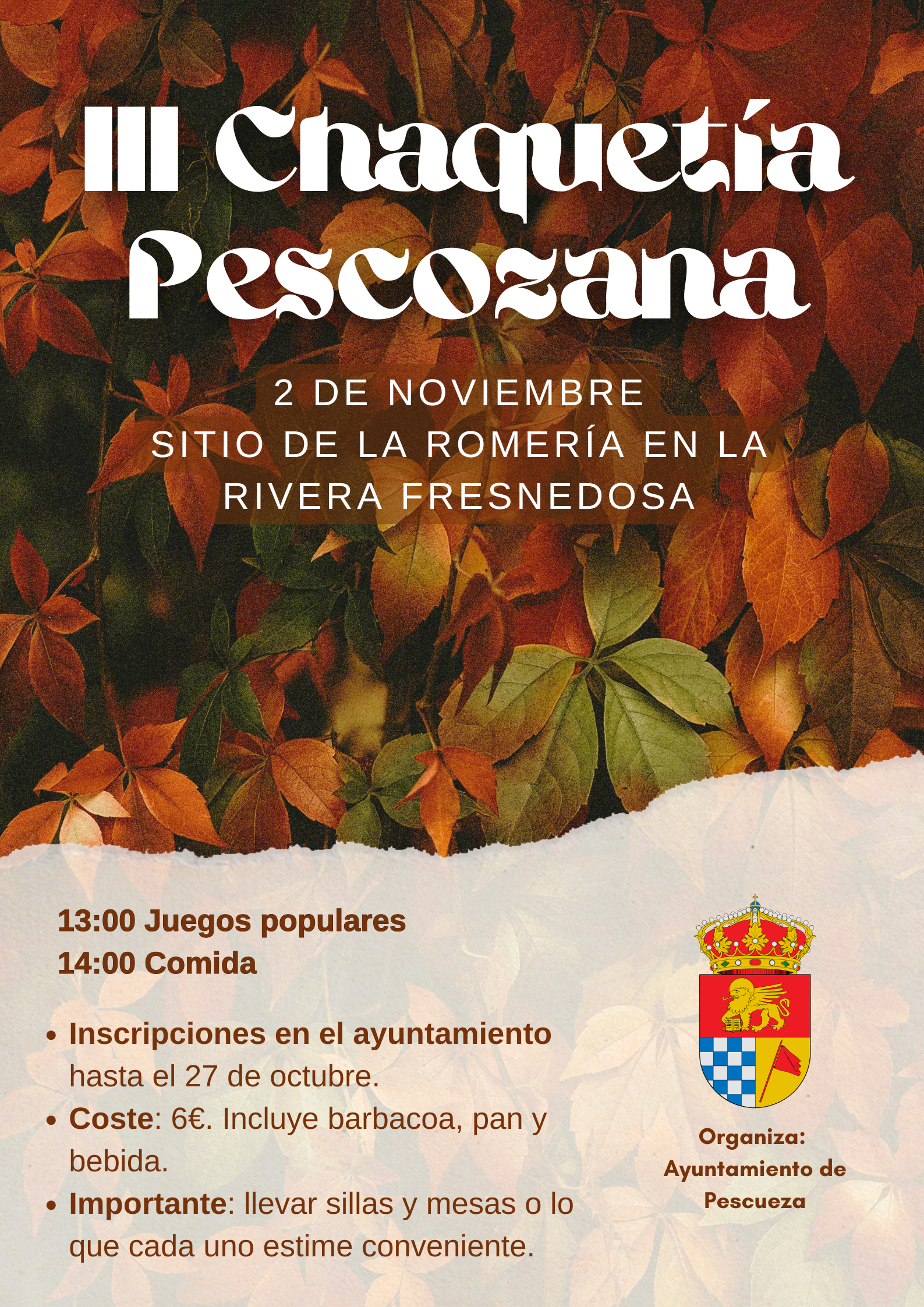 El Ayuntamiento de Pescueza invita a todos los vecinos a disfrutar de la III Chaquetía Pescozana, que se celebrará el domingo 2 de noviembre en el sitio de la Romería, junto a la Rivera Fresnedosa.