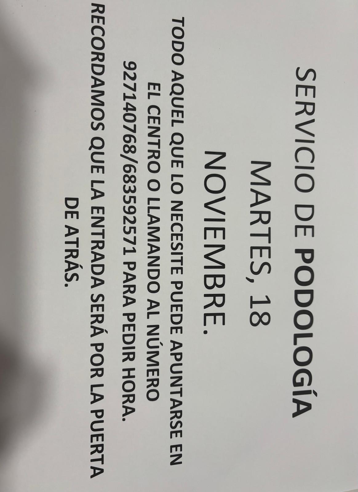 La Asociación Amigos de Pescueza informa a todas las personas interesadas, que el próximo MARTES 18 DE NOVIEMBRE se prestará servicio de PODOLOGÍA en el centro residencial . Será necesaria cita previa, para evitar acumulaciones. Todo aquel que lo necesite puede apuntarse en él centro o llamando al 927140768/683592571.