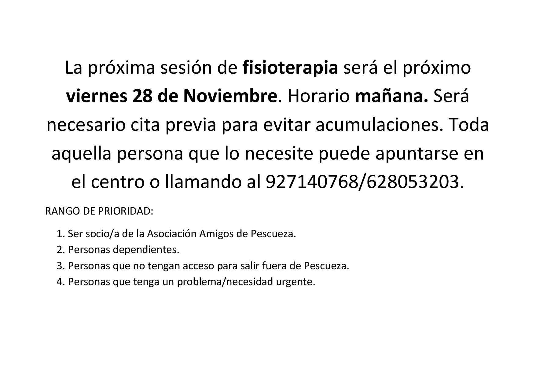 La próxima sesión de fisioterapia será el próximo viernes 28 de Noviembre. Horario mañana. Será necesario cita previa para evitar acumulaciones. Toda aquella persona que lo necesite puede apuntarse en el centro o llamando al 927140768/628053203.