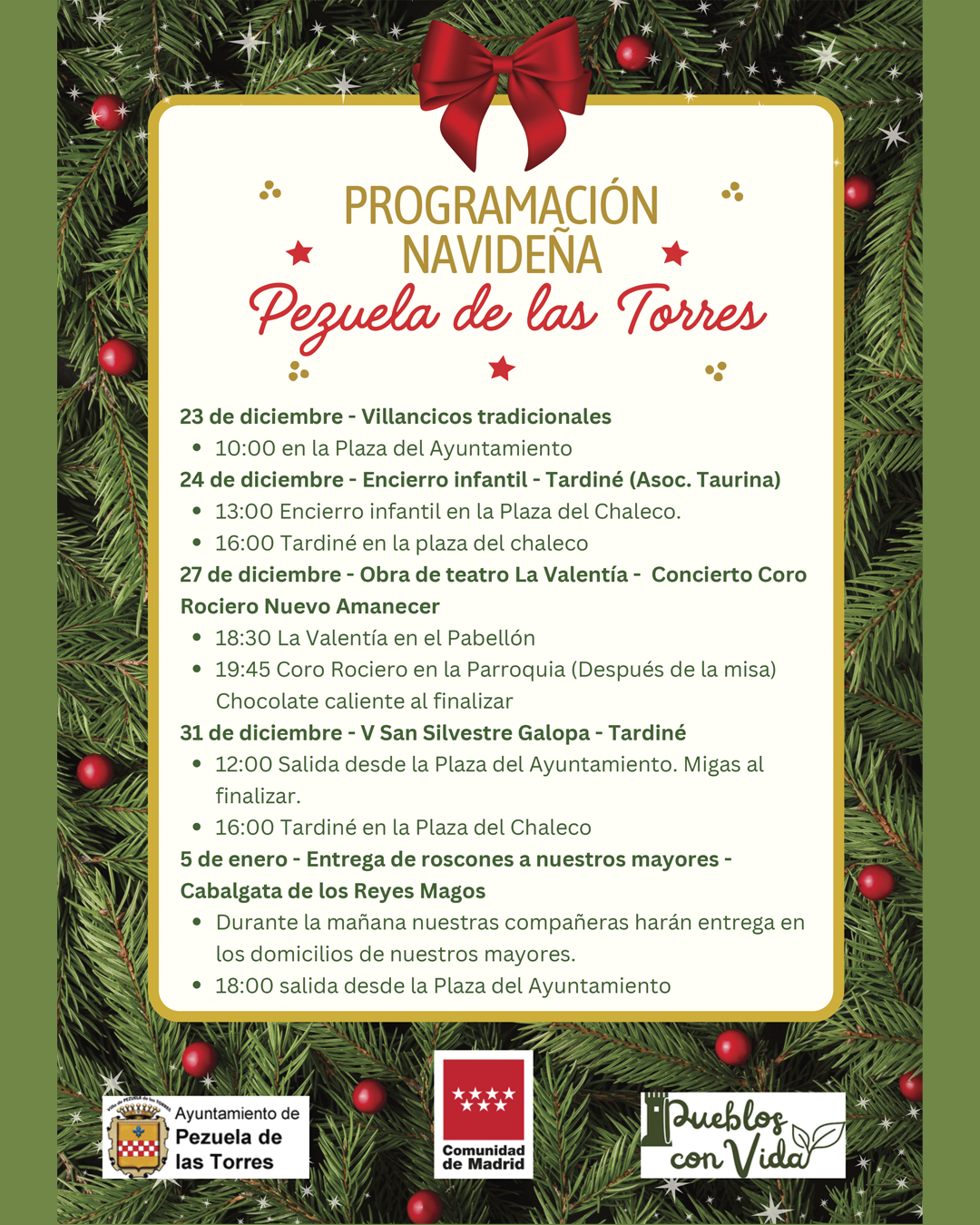 Para estos días tan especiales, y en colaboración con nuestras asociaciones, hemos preparado una completa programación de actividades dentro del programa Pueblos con Vida de la Comunidad de Madrid, pensadas para que todos podamos disfrutar, compartir y vivir la Navidad en nuestro pueblo 🎶🎁