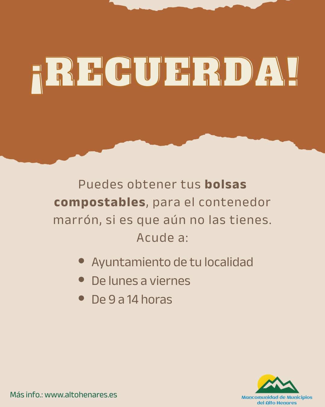 Para facilitar su correcto uso, desde la Mancomunidad nos recuerdan que podéis recoger bolsas compostables en vuestro ayuntamiento, necesarias para depositar adecuadamente los restos orgánicos.