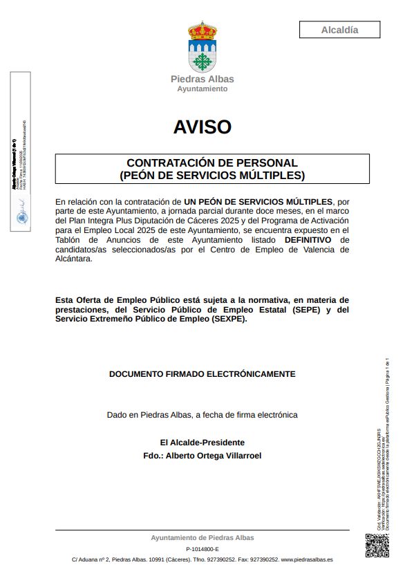 En relación con la contratación de UN PEÓN DE SERVICIOS MÚLTIPLES, por parte de este Ayuntamiento, a jornada parcial durante doce meses, en el marco del Plan Integra Plus Diputación de Cáceres 2025 y del Programa de Activación para el Empleo Local 2025 de este Ayuntamiento, se encuentra expuesto en el Tablón de Anuncios de este Ayuntamiento listado DEFINITIVO de candidatos/as seleccionados/as por el Centro de Empleo de Valencia de Alcántara.