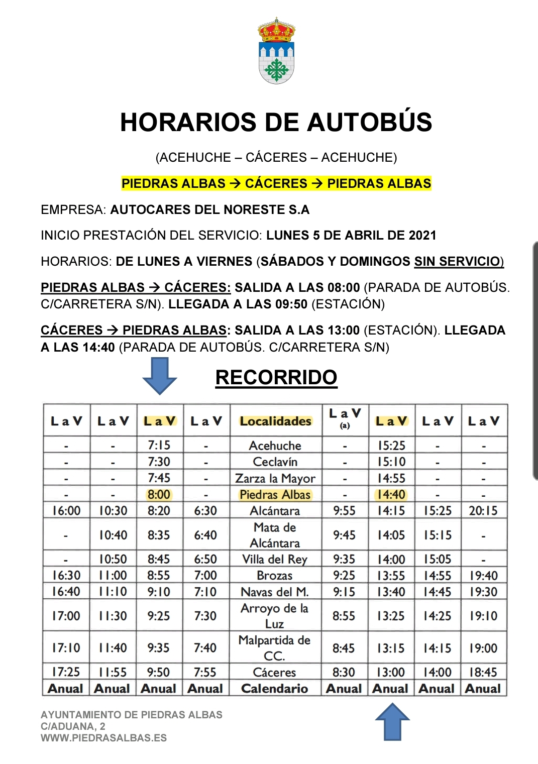 Se informa de los horarios del servicio de autobuses hacia Cáceres (ida y vuelta) y la información de la nueva empresa adjudicataria del servicio, a partir del próximo lunes día 5 de abril.