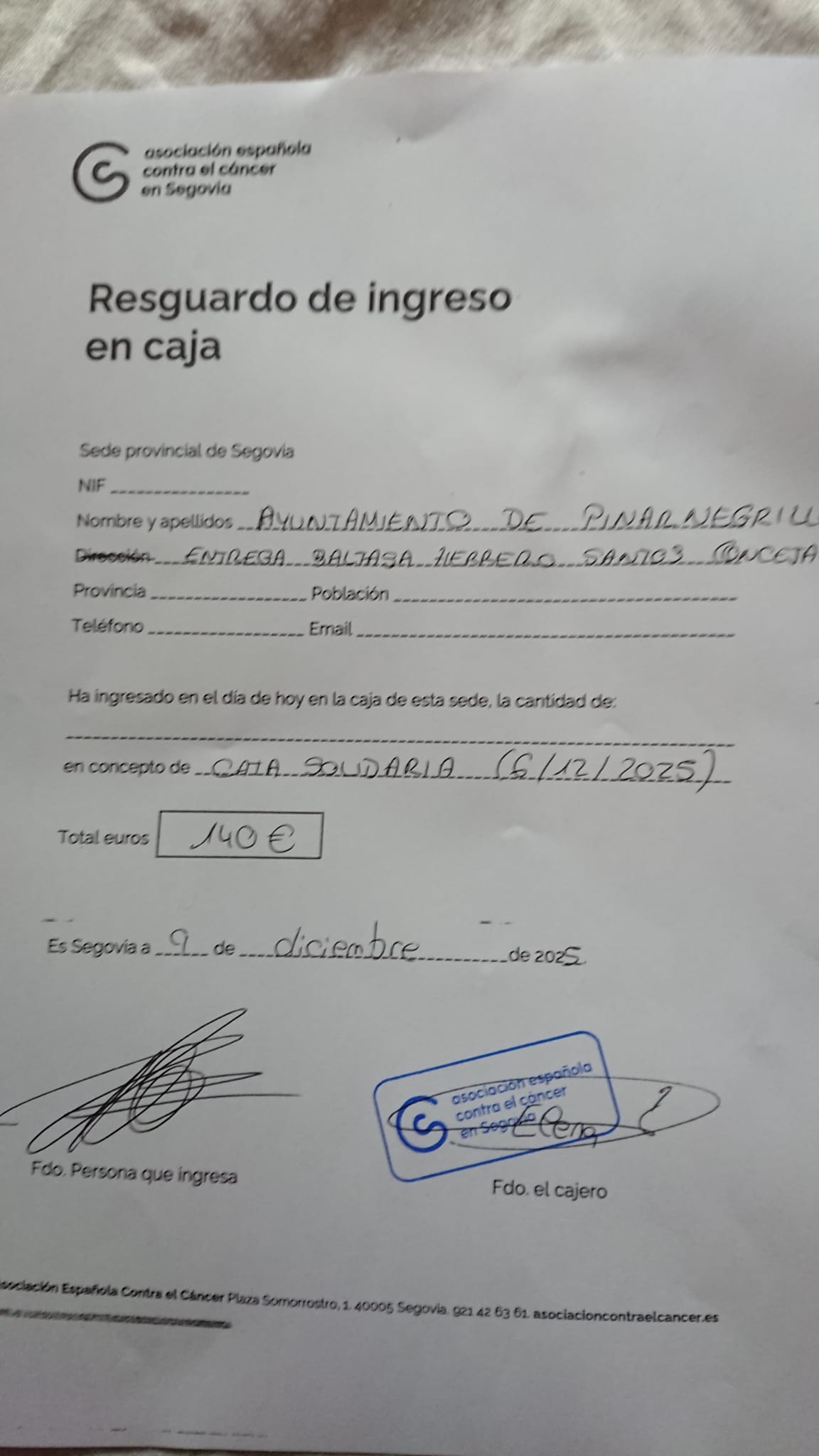 Por este medio se informa que en relación a la cata de jamón solidaria llevada a cabo en el local del bar de Pinarnegrillo, el pasado día seis del actual, hubo una recaudación de 140€, que en la mañana del día de ayer, fueron entregadas en la Asociación Española contra el cáncer de Segovia, con el agradecimiento correspondiente de su Presidente.