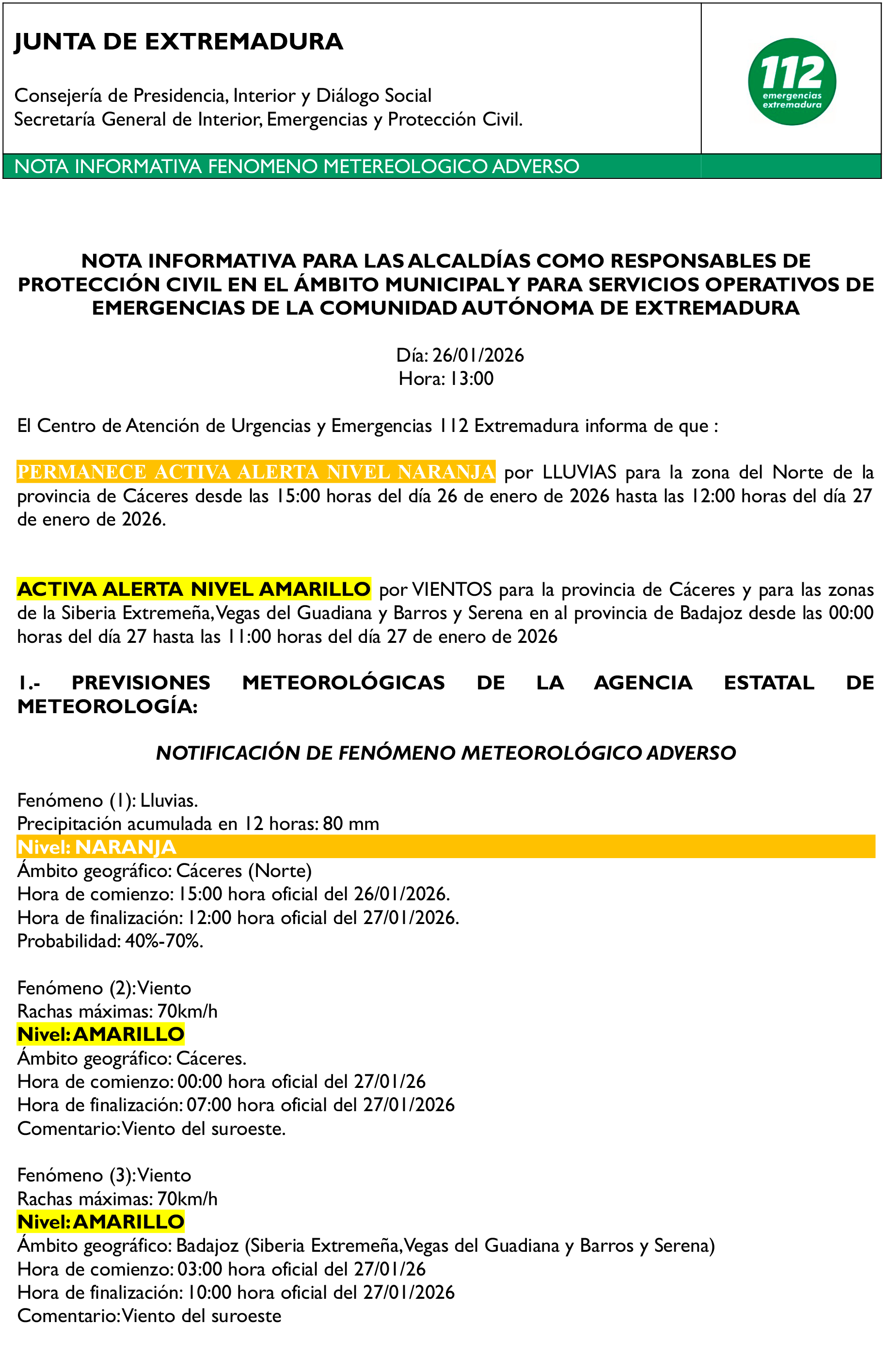 Se informa a las Alcaldías y Recursos de emergencia de la Comunidad Autónoma de Extremadura que la Dirección del Plan INUNCAEX, declara la Fase de Emergencia en Situación Operativa 0 a las 21:30 horas de hoy día 27 de enero de 2026 para la Comunidad Autónoma de Extremadura debido a las precipitaciones previstas y a los registros hidrológicos recogidos por las Confederaciones Hidrográficas