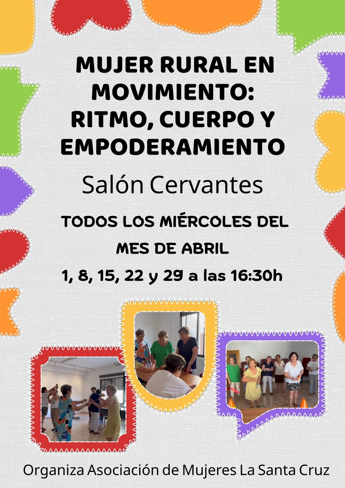 La Asociación de Mujeres "Santa Cruz" de la localidad, organiza el taller: "Mujer rural en movimiento: Ritmo, cuerpo y empoderamiento", que se celebrará en 5 sesiones durante todos los miércoles del mes de abril: días 1,8,15,22 y 29 a las 16:30 h. en el SALÓN CERVANTES.