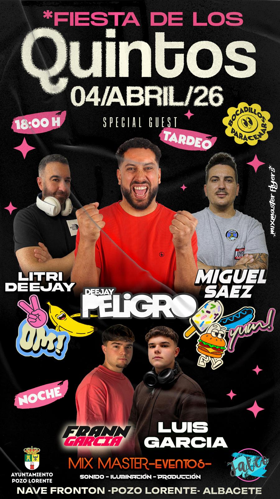 El sábado 4 de abril, un año más, te invitamos a reencontrarte con tus quintos y quintas. GRAN FIESTA TARDEO, con la música de los mejores Dj´S: (LITRI, PELIGRO, MIGUEL SÁEZ, FRAN Y LUIS GARCÍA) y presentación de la Corte de Honor Juvenil de las fiestas en honor a la Santa Cruz. A partir de las 18:00 h. en la nave del frontón.