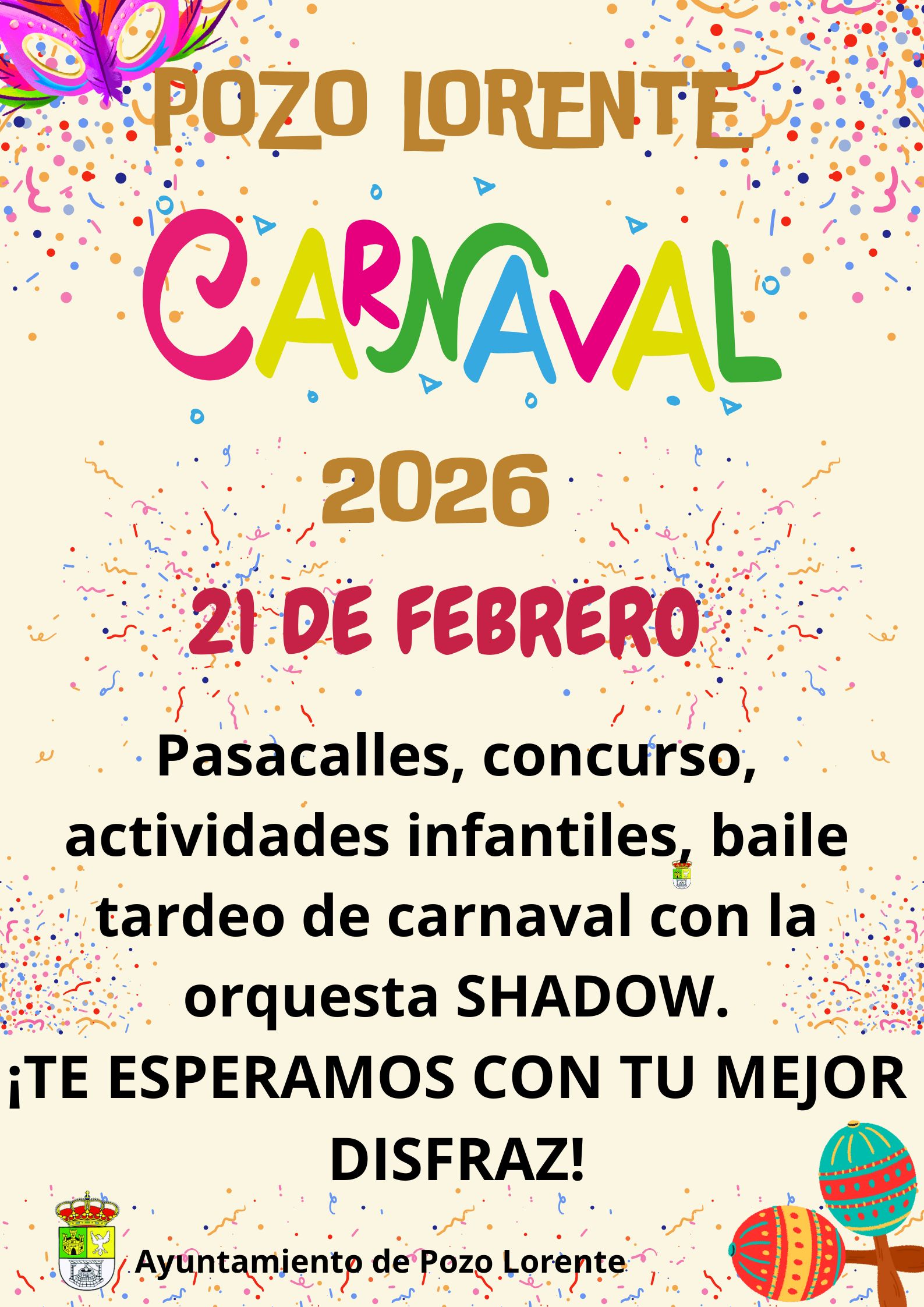 CARNAVAL 20262026-02-02 09:16:35Info GeneralEl próximo día 21 de febrero, un año más, Pozo Lorente recibe el CARNAVAL como se merece. Prepara tu disfraz y ven a disfrutar a lo grande de una jornada de carnaval con tu grupo de amigos y familiares. Al igual que el año pasado la música, el colorido y la alegría, inundarán nuestras calles con el desfile de carnaval . Posteriormente en la nave del frontón: baile tardeo de carnaval con la orquesta SHADOW, actividades infantiles(merienda, hinchable, talleres, juegos...) y el tradicional concurso de disfraces (en breve publicación de las bases).