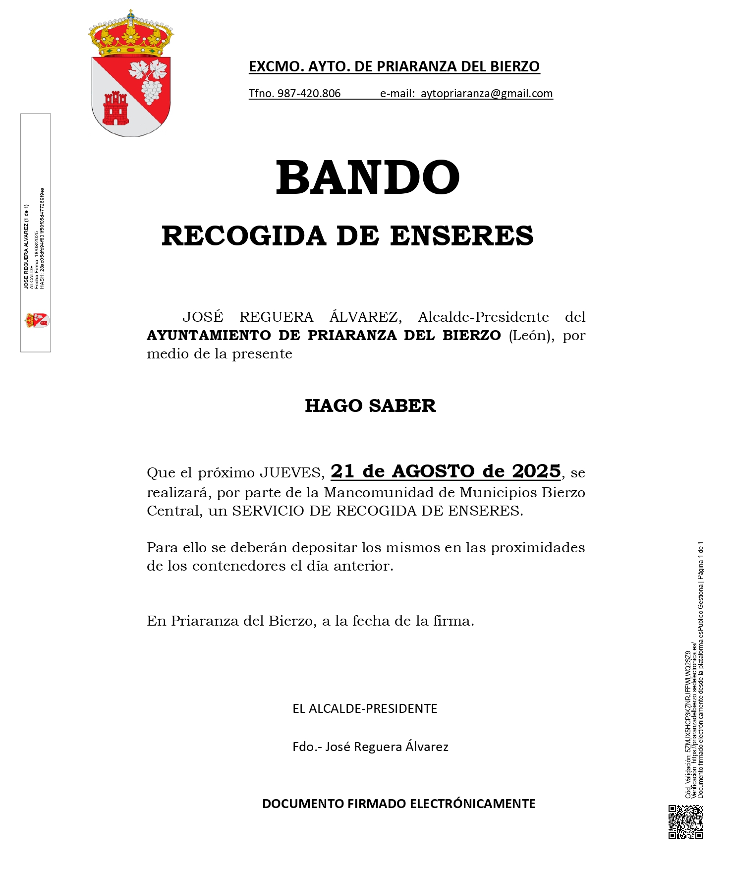 Os recordamos que el próximo JUEVES día 21 de AGOSTO de 2025 la Mancomunidad de Municipios Bierzo Central realizará un servicio de recogida de enseres. 🚛