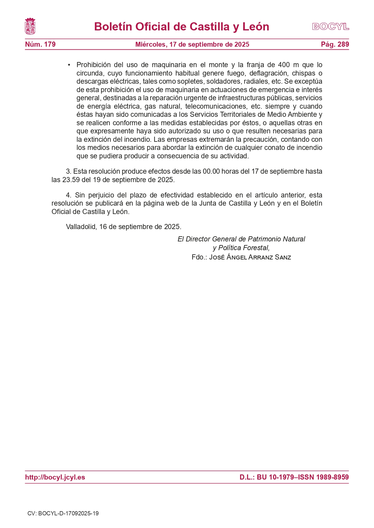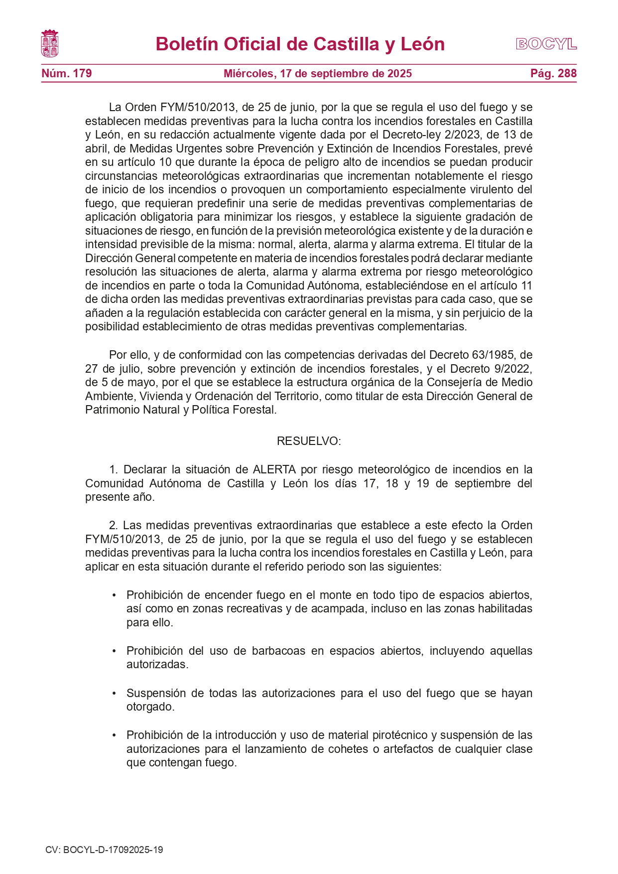 -> Las medidas preventivas extraordinarias que establece a este efecto la Orden FYM/510/2013, de 25 de junio, por la que se regula el uso del fuego y se establecen medidas preventivas para la lucha contra los incendios forestales en Castilla y León, para aplicar en esta situación durante el referido periodo son las siguientes:
