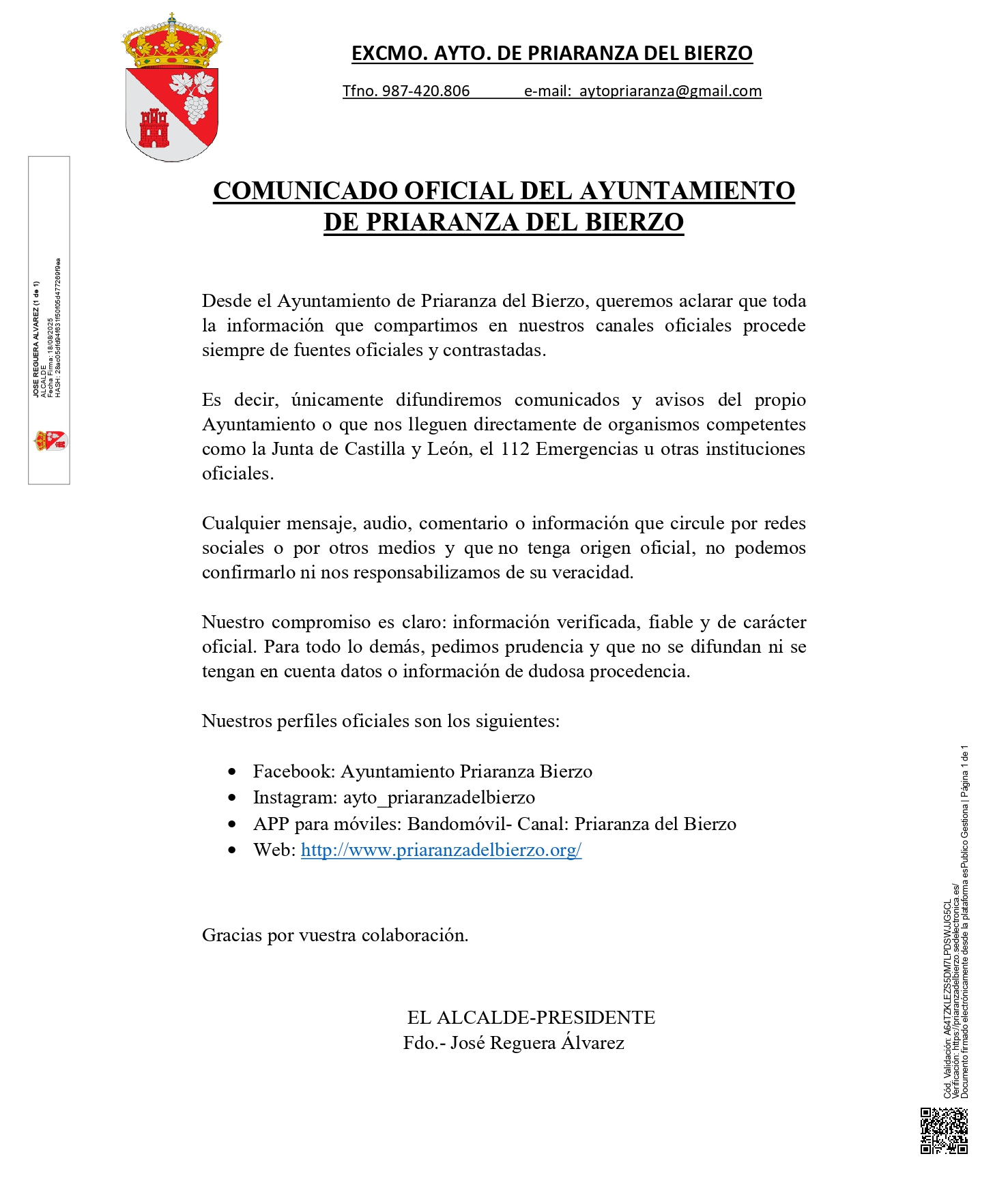 Desde el Ayuntamiento de Priaranza del Bierzo, queremos aclarar que toda la información que compartimos en nuestros canales oficiales procede SIEMPRE de fuentes oficiales y contrastadas.