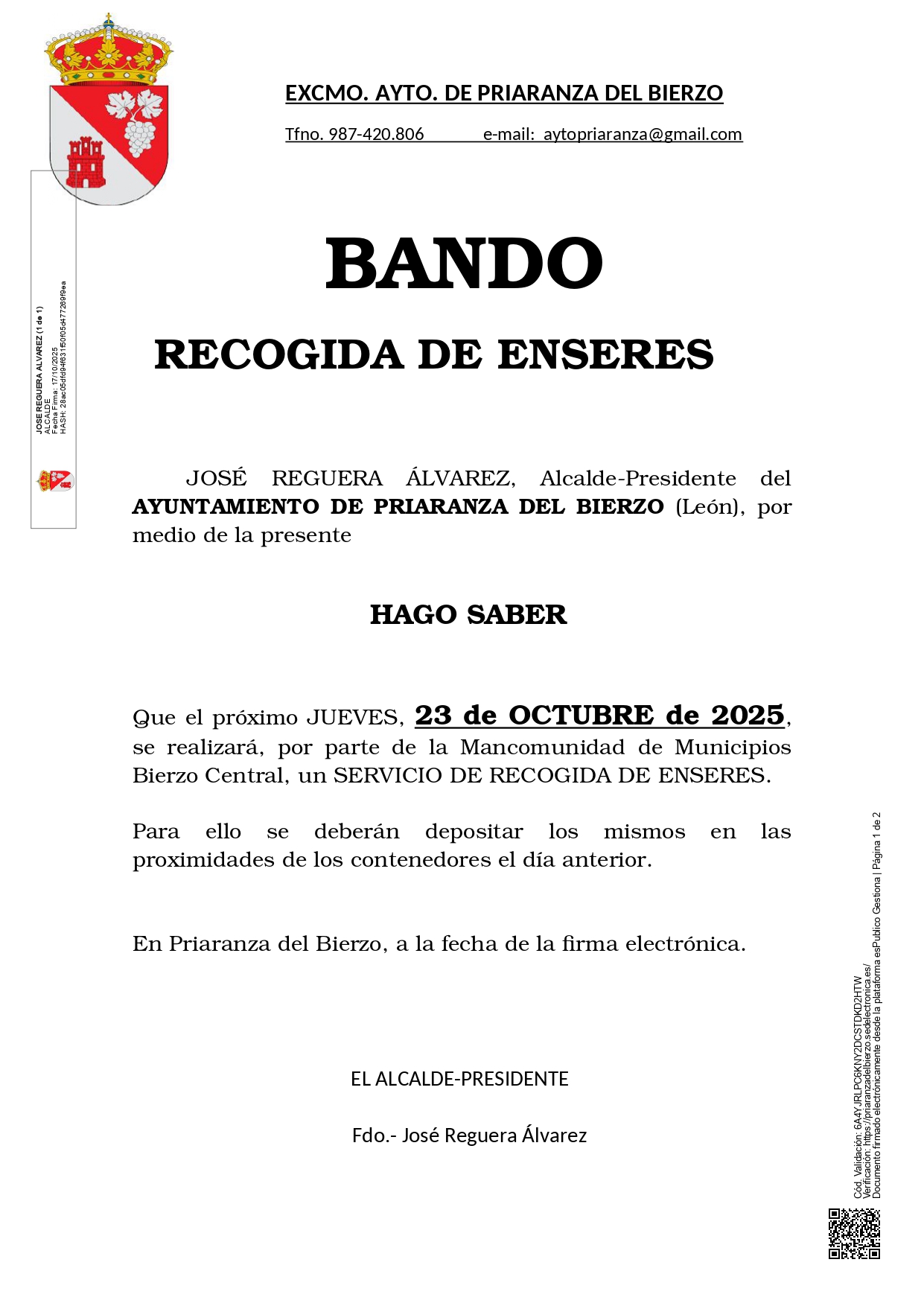 Os recordamos que el próximo JUEVES día 23 de OCTUBRE de 2025 la Mancomunidad de Municipios Bierzo Central realizará un servicio de recogida de enseres. 🚛