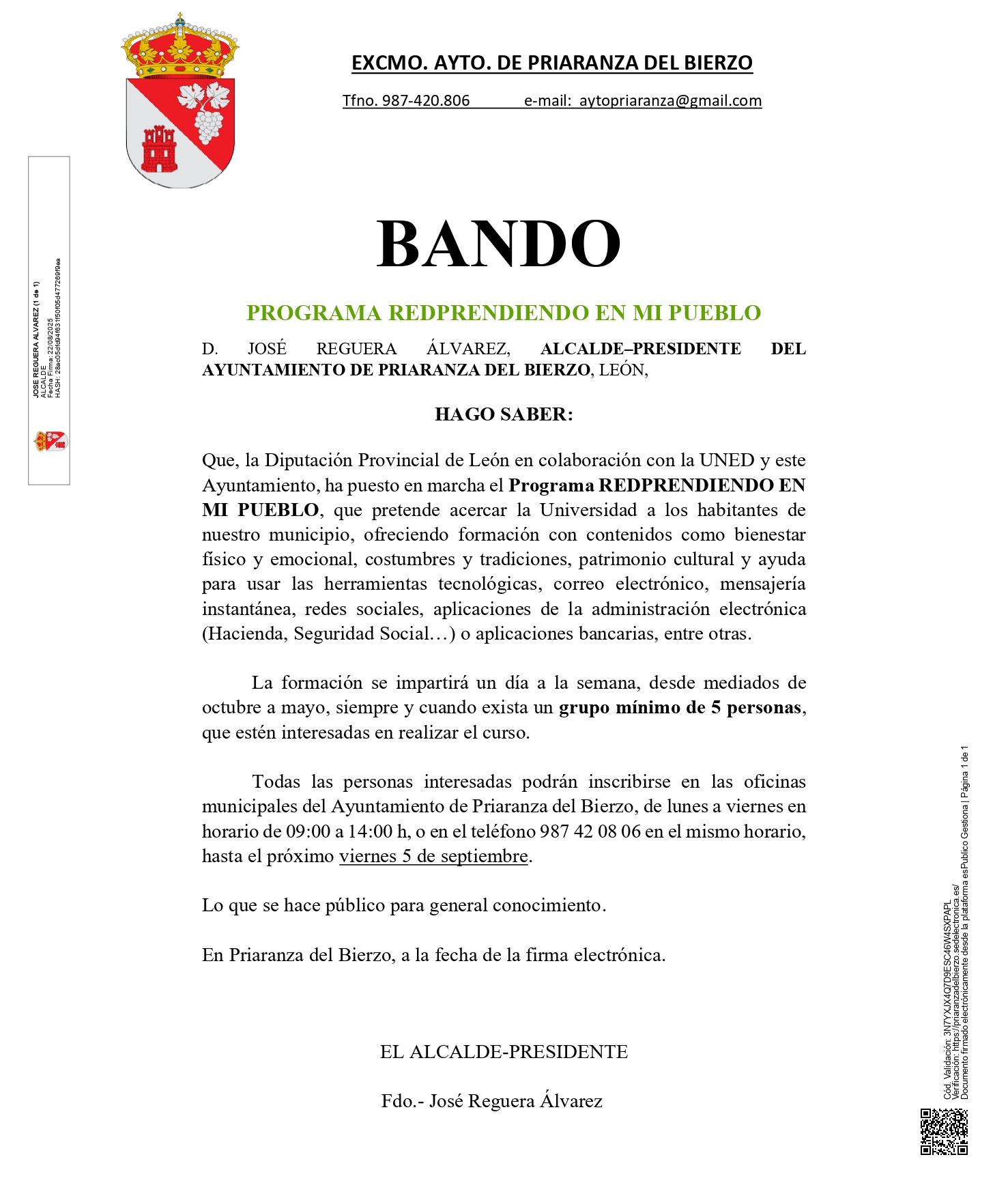 La Diputación de León en colaboración con la UNED y este Ayuntamiento, ha puesto en marcha el Programa REDPRENDIENDO EN MI PUEBLO, que pretende acercar la Universidad a los habitantes de nuestro municipio, ofreciendo formación con contenidos como bienestar físico y emocional, costumbres y tradiciones, patrimonio cultural y ayuda para usar las herramientas tecnológicas, correo electrónico, mensajería instantánea, redes sociales, aplicaciones de la administración electrónica (Hacienda, Segurid(...)