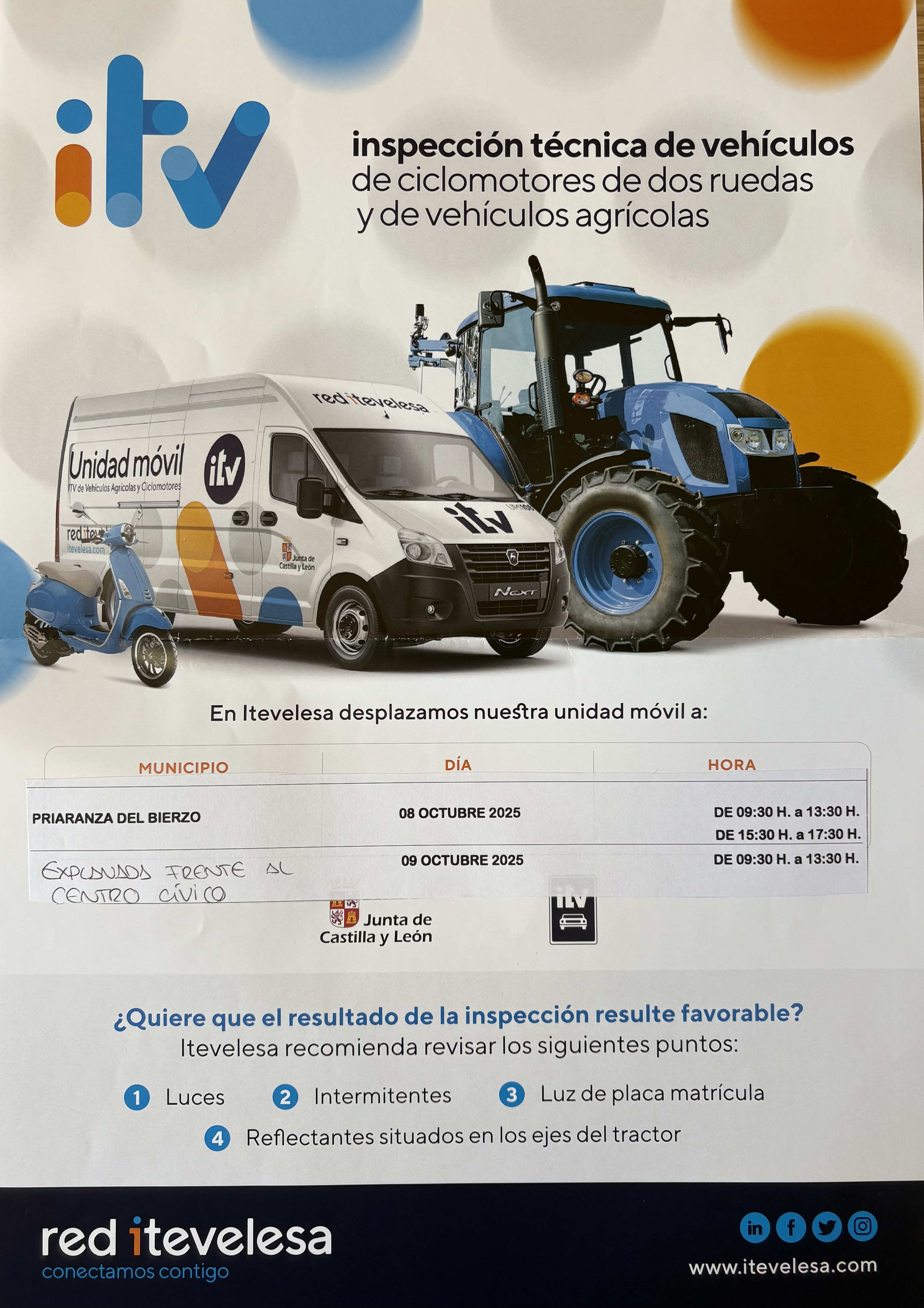 La ITV se llevará a cabo los días 8 y 9 de octubre de 2025 en la misma ubicación de cada año, la explanada frente al Centro Cívico de Villalibre de la Jurisdicción.