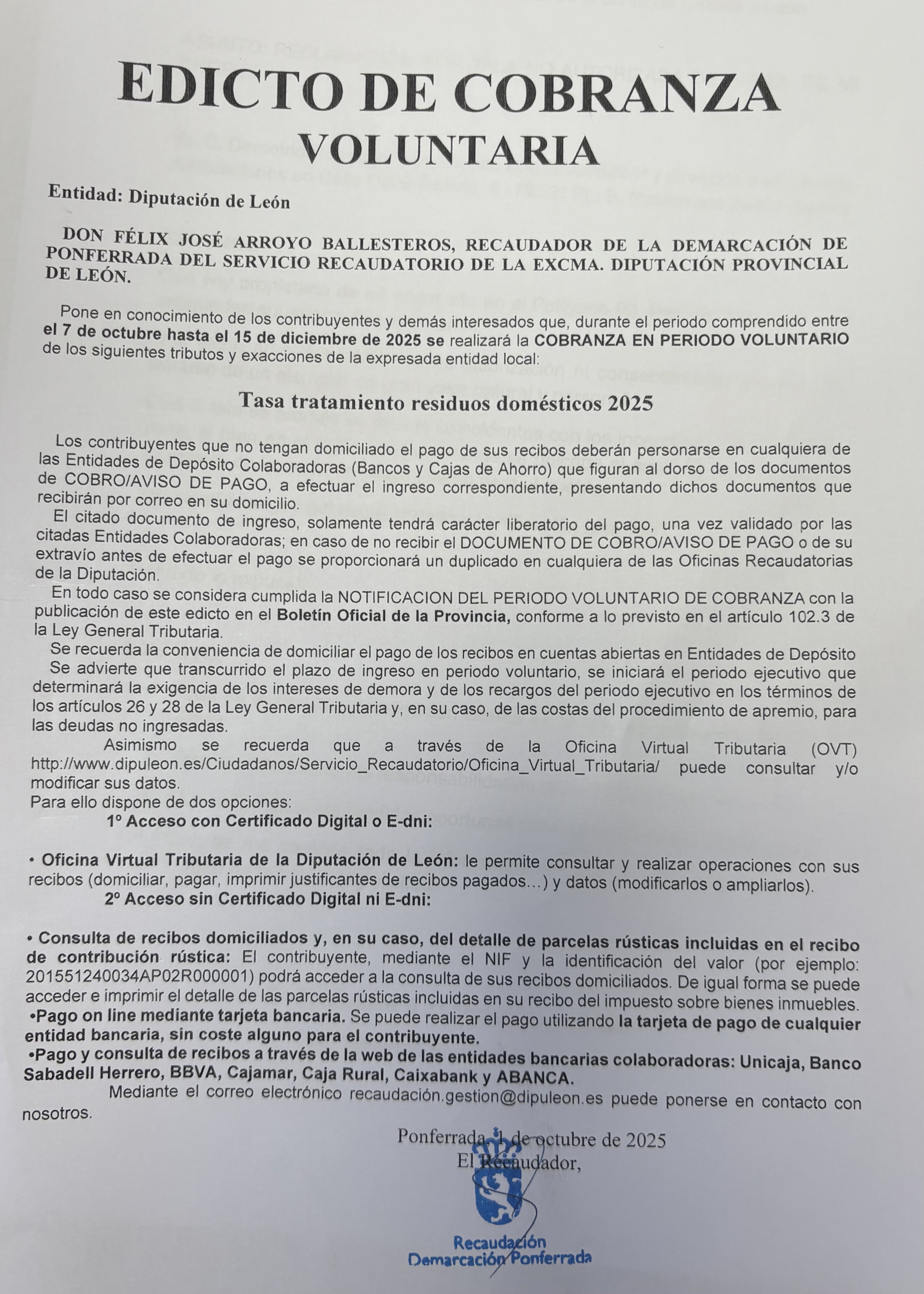 EDICTO COBRANZA VOLUNTARIA IBI - IAE 2025 y TASA TRATAMIENTO RESIDUOS DOMÉSTICOS 2025