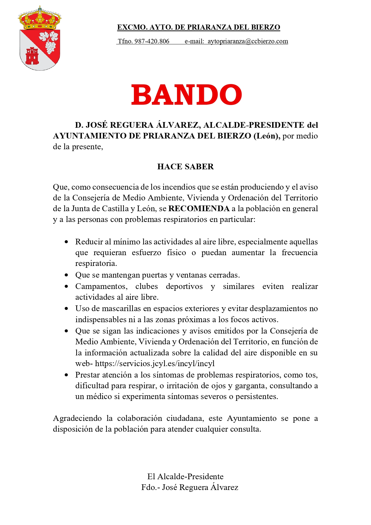 El Alcalde de Priaranza del Bierzo, José Reguera, ha actualizado las recomendaciones en un Bando Municipal a consecuencia de los incendios que continúan en la comarca.