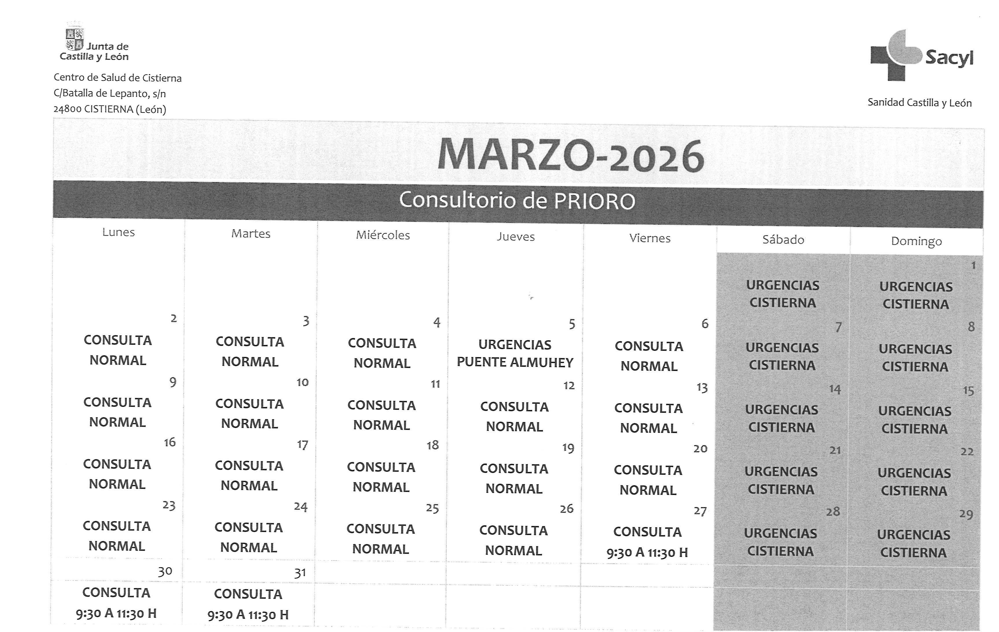 HORARIO CONSULTORIO MÉDICO ULTIMA SEMANA DE MES