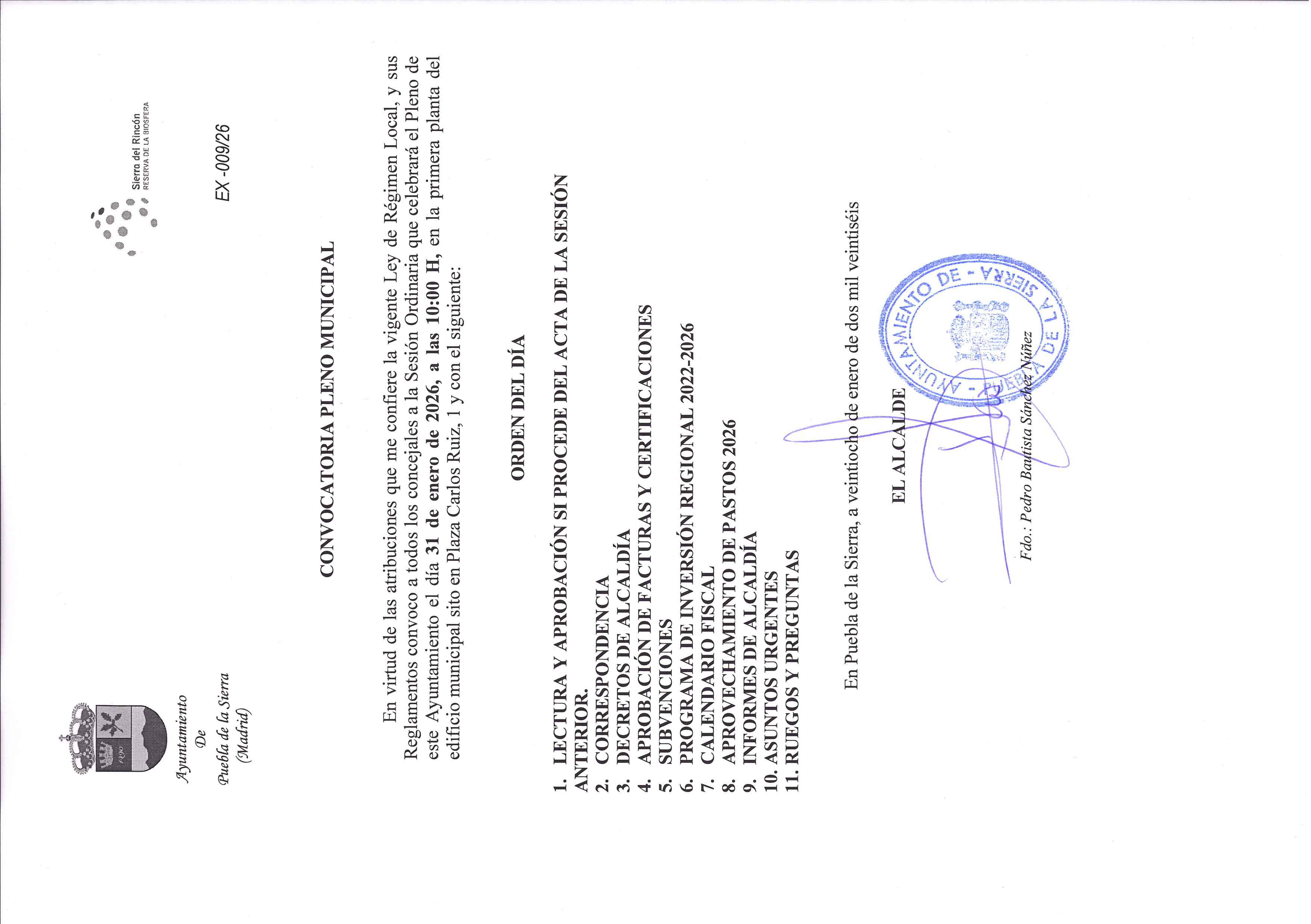 por la presente se convoca Pleno ordinario de la Corporación con fecha de 29 de noviembre de 2025, a las 9:30 horas en el salón de Plenos del Ayuntamiento.