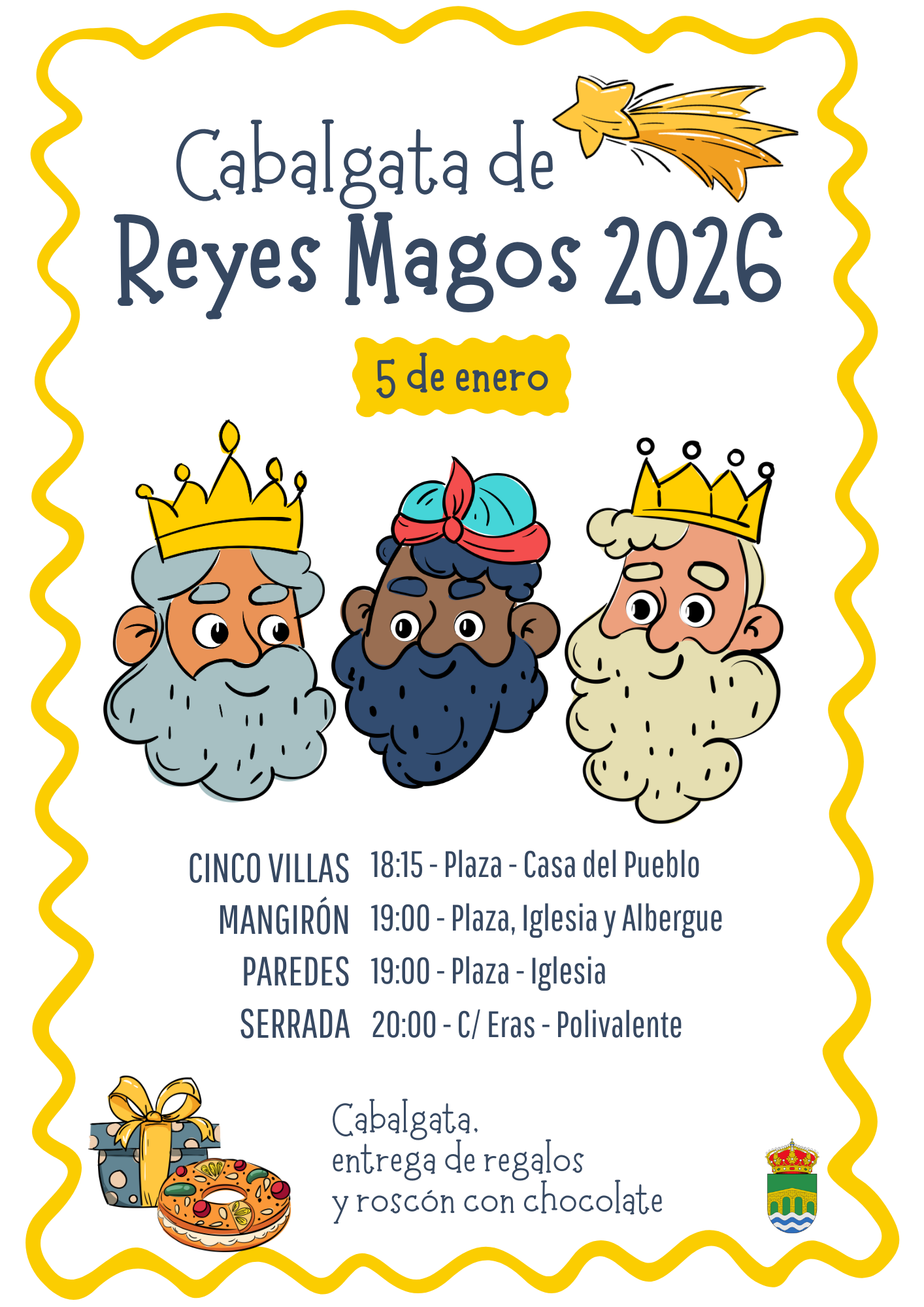 El 5 de enero, Sus Majestades los Reyes Magos recorrerán nuestros pueblos en una tarde llena de ilusión, sonrisas y tradición. El desfile hará parada en Cinco Villas a las 18:15 h (Plaza – Casa del Pueblo), en Mangirón a las 19:00 h (Plaza, Iglesia y Albergue), en Paredes a las 19:00 h (Plaza – Iglesia) y en Serrada a las 20:00 h (C/ Eras – Poli(...)