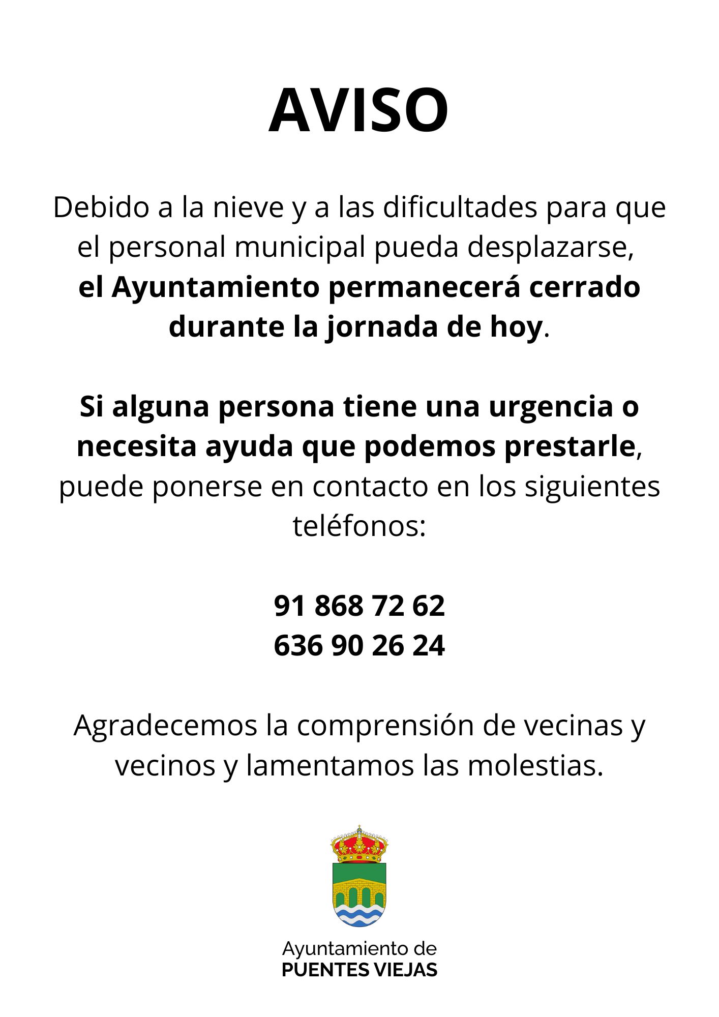 Debido a la nieve y a las dificultades para que el personal municipal pueda desplazarse, el Ayuntamiento permanecerá cerrado durante la jornada de hoy.