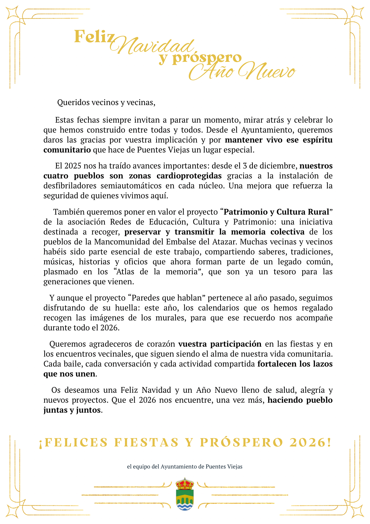 A continuación, os compartimos la carta que hemos enviado a vuestros domicilios junto con el Calendario 2026. Este calendario es fruto de la creatividad y del trabajo conjunto de las personas que participaron en el proyecto “Paredes que hablan”.