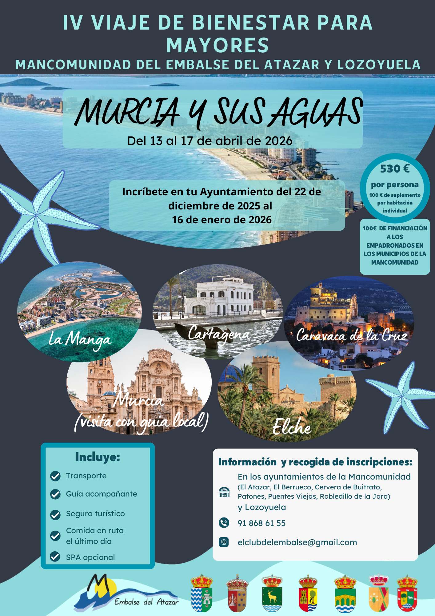 La Mancomunidad del Embalse del Atazar y Lozoyuela organiza el IV Viaje de Bienestar para Mayores, con destino Murcia y sus aguas, que se celebrará del 13 al 17 de abril de 2026.