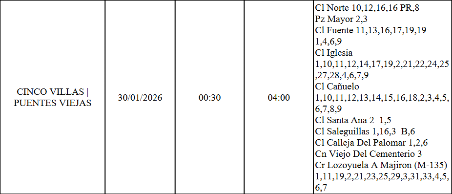 Se informa a los vecinos de Cinco Villas que, debido a trabajos de ampliación y mantenimiento realizados por Iberdrola, se producirá un corte de suministro el próximo viernes 30 de enero de 2026, entre las 00:30 y las 04:00 horas, en varias calles del municipio. Rogamos disculpen las molestias.