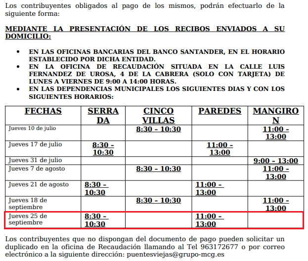 Los horarios serán de 8:30 a 10:30 en la Sala Polivalente de Cinco Villas y de 11:00 a 13:00 en las oficinas del Ayuntamiento en Mangirón.