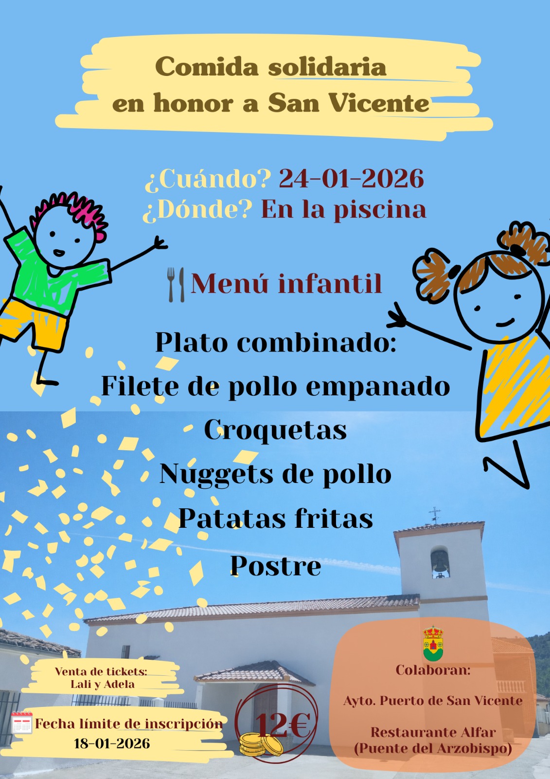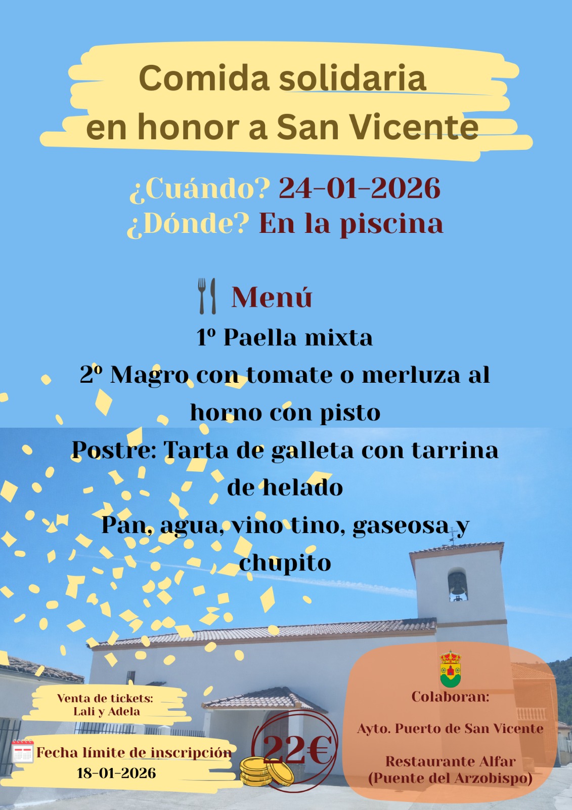 El Ayuntamiento de Puerto de San Vicente informa a todos los vecinos y vecinas que el próximo día 24, con motivo de las Fiestas de San Vicente, celebraremos la ya tradicional y esperada Comida Solidaria, una cita que año tras año nos reúne alrededor de la mesa para compartir, convivir y disfrutar juntos.