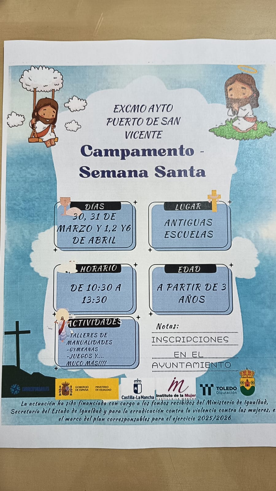 El Excmo. Ayuntamiento de Puerto de San Vicente informa que, con motivo de las vacaciones de Semana Santa se organiza un campamento dirigido a niños y niñas a partir de 3 años, con el objetivo de ofrecer actividades lúdicas, educativas y de conciliación familiar.