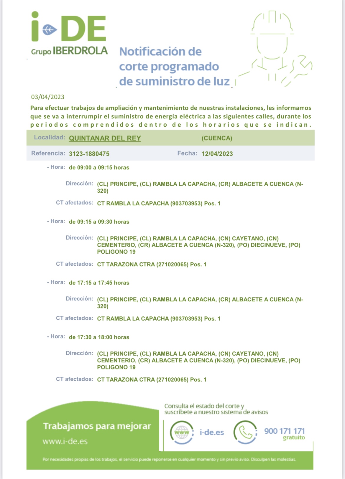 Iberdrola informa de que el miƩrcoles 12 de abril va a realizar varios cortes de luz en diferentes tramos y horarios. Se puede consultar en la imagen adjunta.