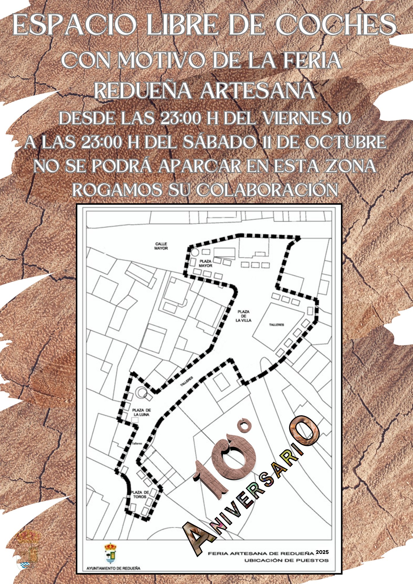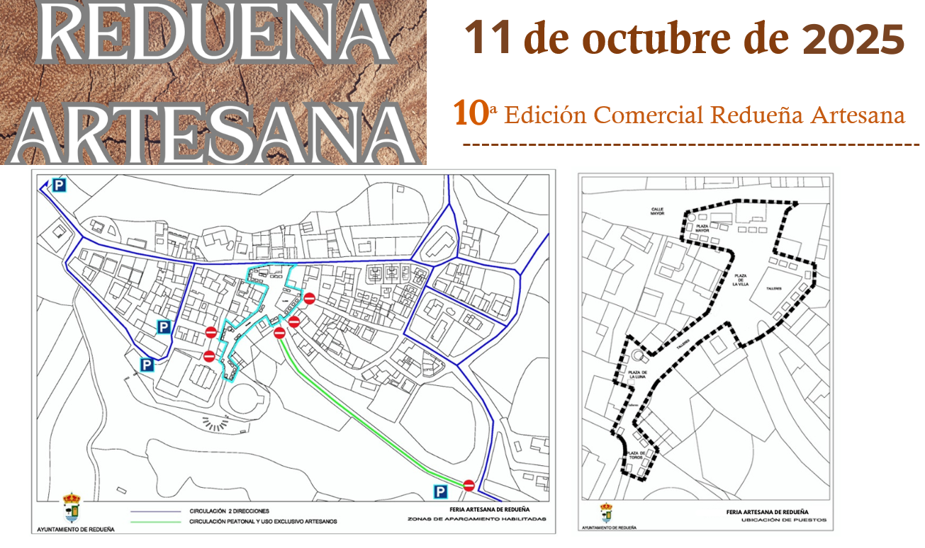 Con motivo de la celebración de la feria Redueña Artesana este sábado 11 de octubre, rogamos a los vecinos su colaboración para dejar despejada de coches la zona centro del pueblo (ver mapa adjunto) entre las 23:00 h de hoy y las 23:00 h de mañana.