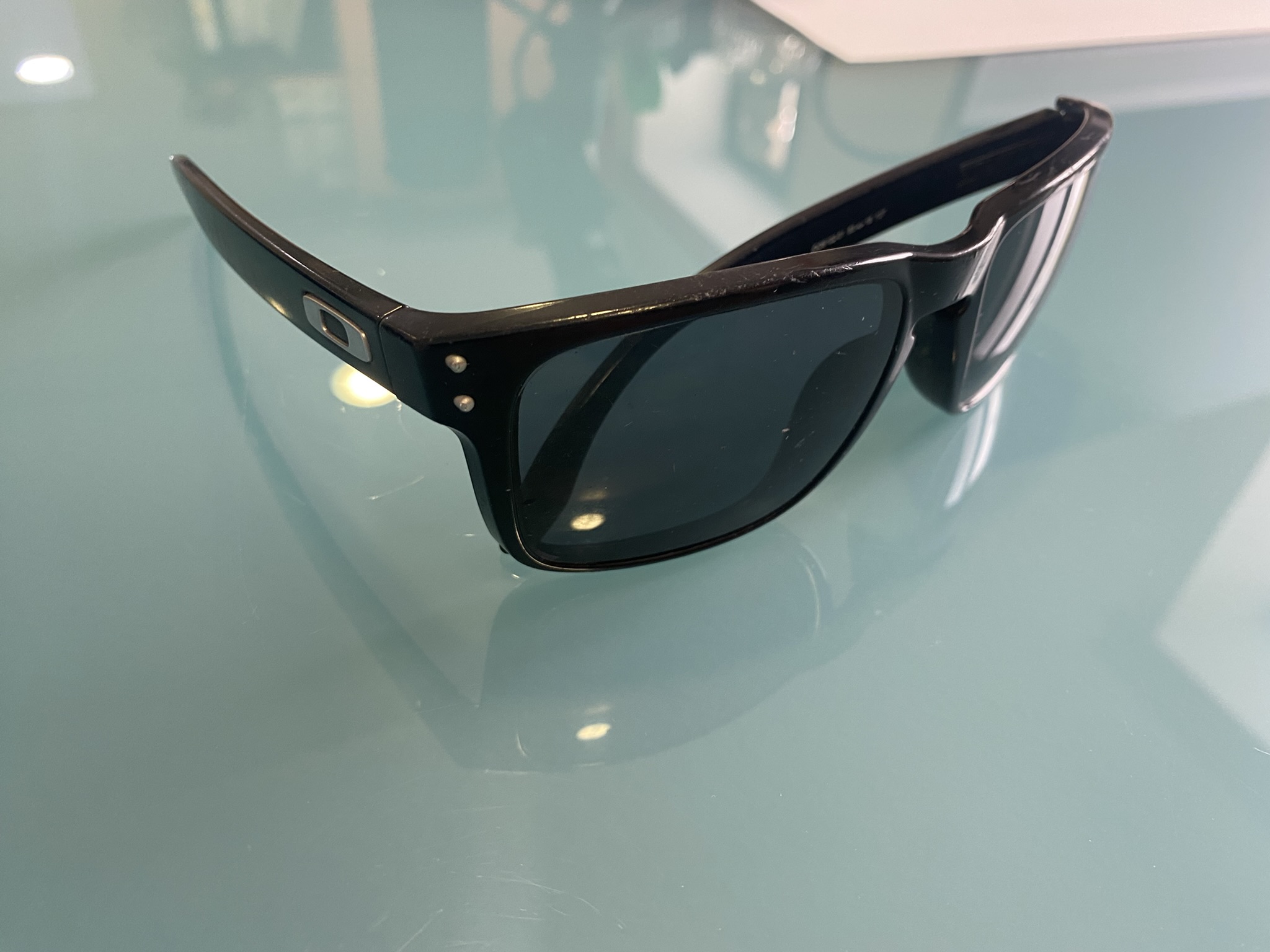 Gafas de sol de la marca Oakley, modelo que parece ser Frogskins, con montura de color negro y cristales oscuros (gris o negro). Se aprecian unos pequeños detalles metálicos (puntos) en la parte frontal de las patillas.