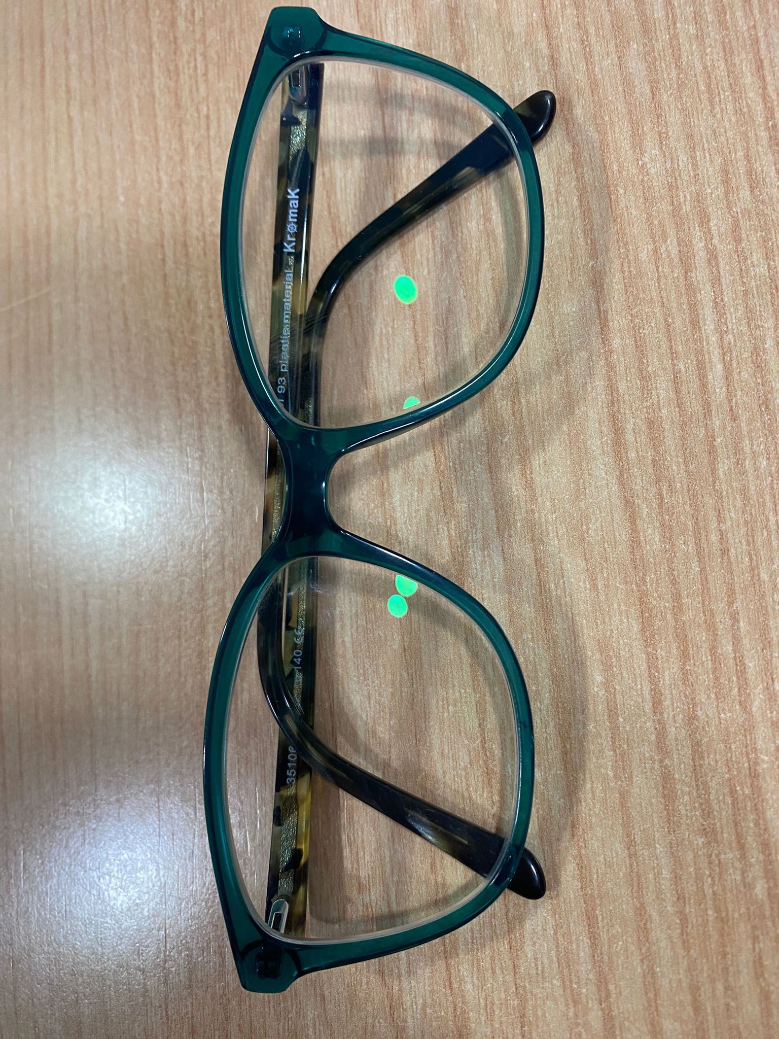 Las gafas son de montura de pasta de color verde oscuro, con varillas de color carey (marrón moteado) en su parte interior, y cristales transparentes.