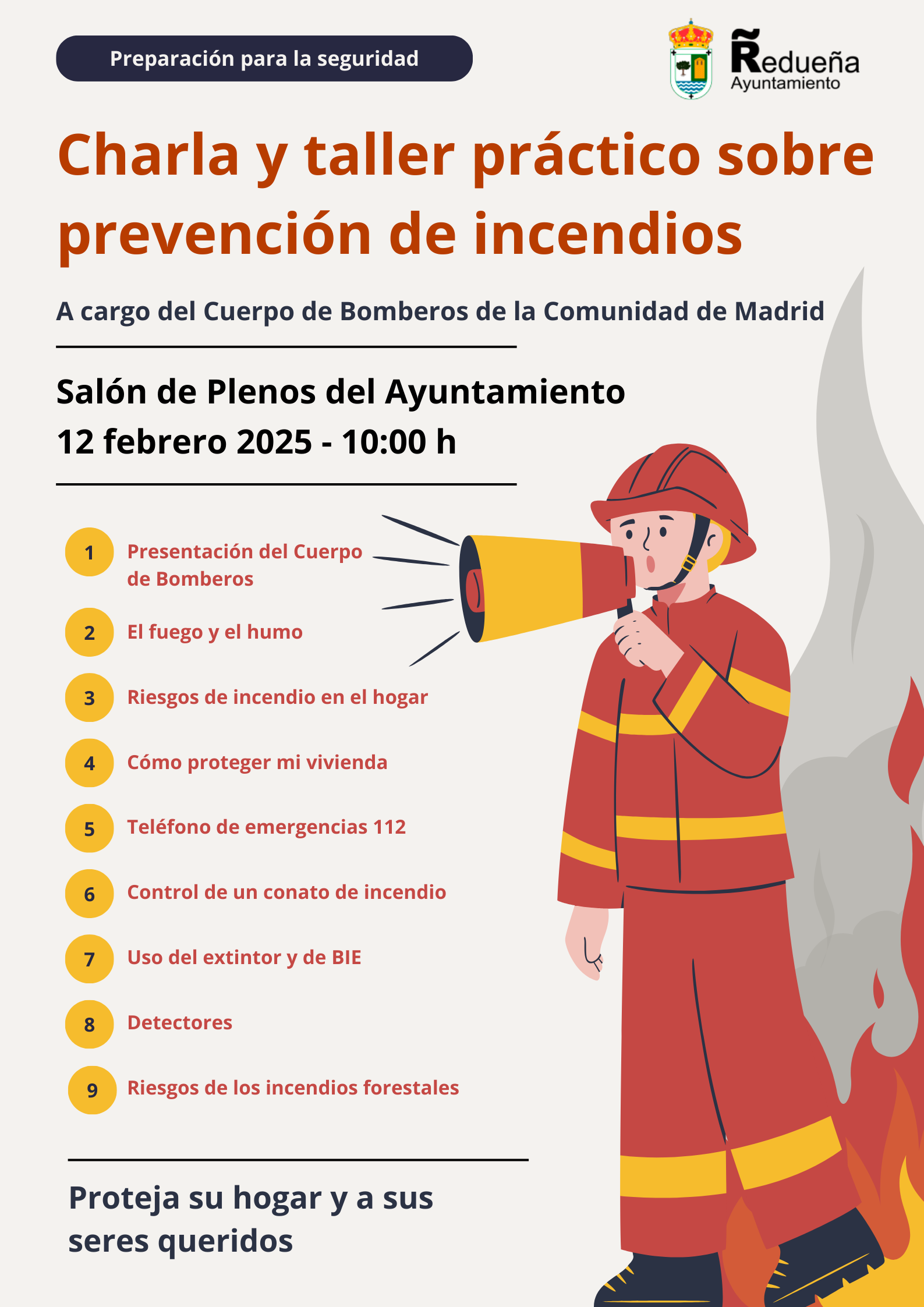 Por ello, Redueña acogerá una de estas jornadas impartidas por profesionales del Cuerpo de Bomberos regional el próximo 12 de febrero a las 10:00 h en el Salón de Plenos del Ayuntamiento.