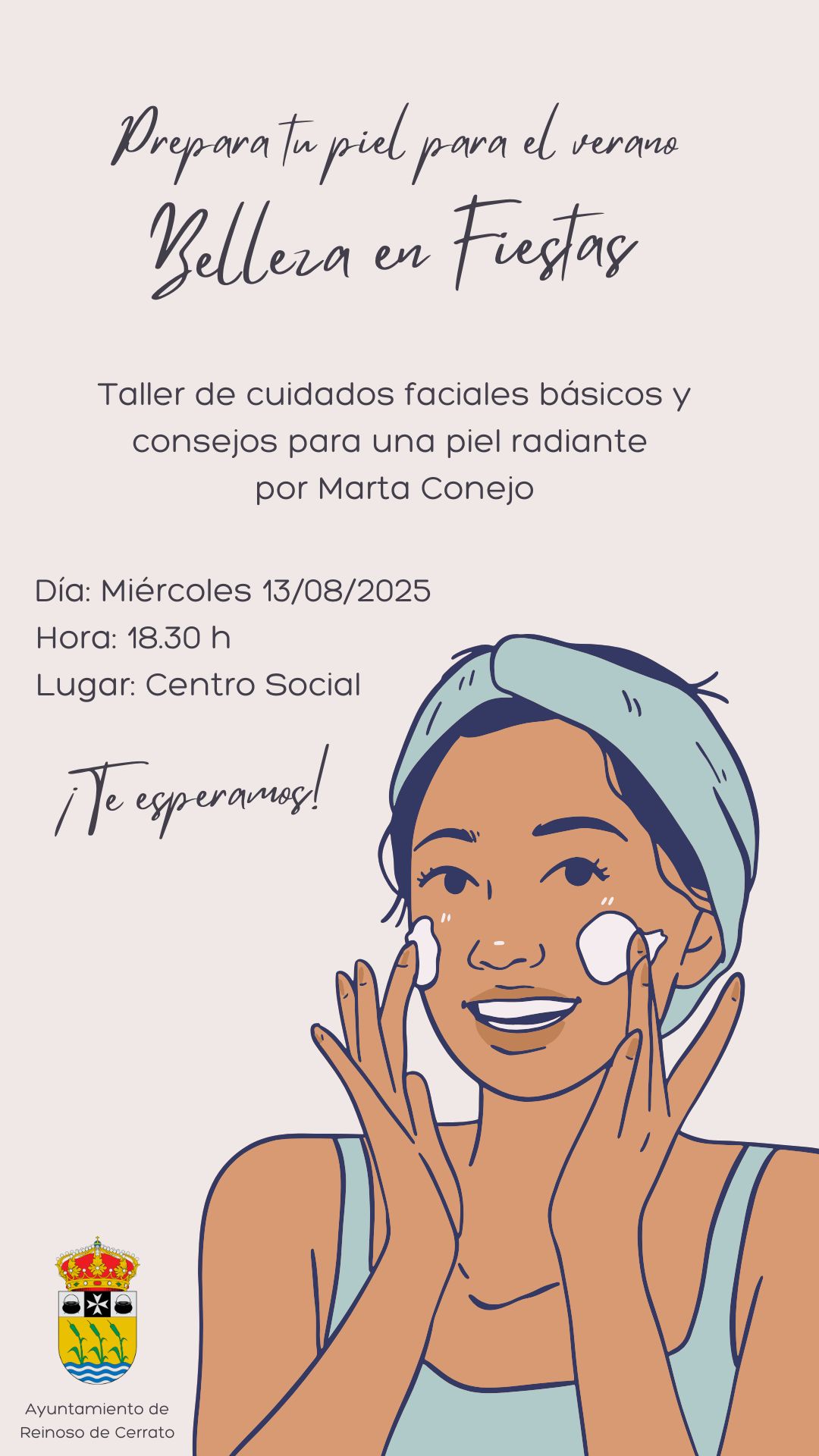 Os recordamos que hoy, a las 18:30 h en el Centro Social, tenemos el Taller de cuidados faciales bΓ‘sicos y consejos para una piel radiante, impartido por Marta Conejo.