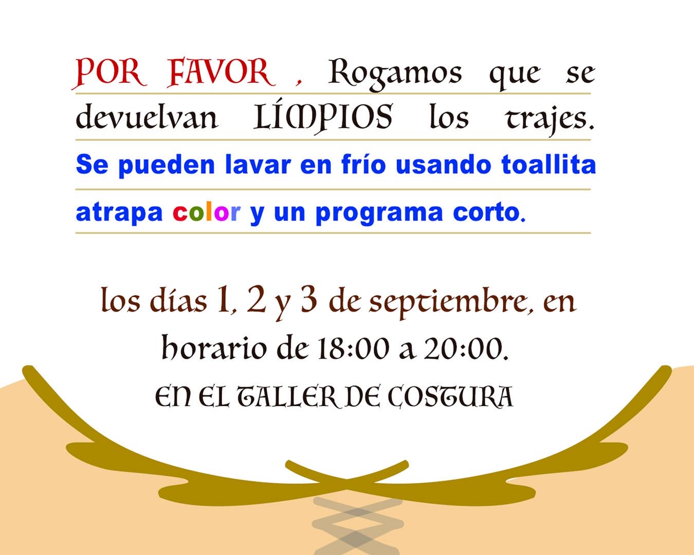 POR FAVOR, Rogamos que se devuelvan LIMPIOS los trajes.