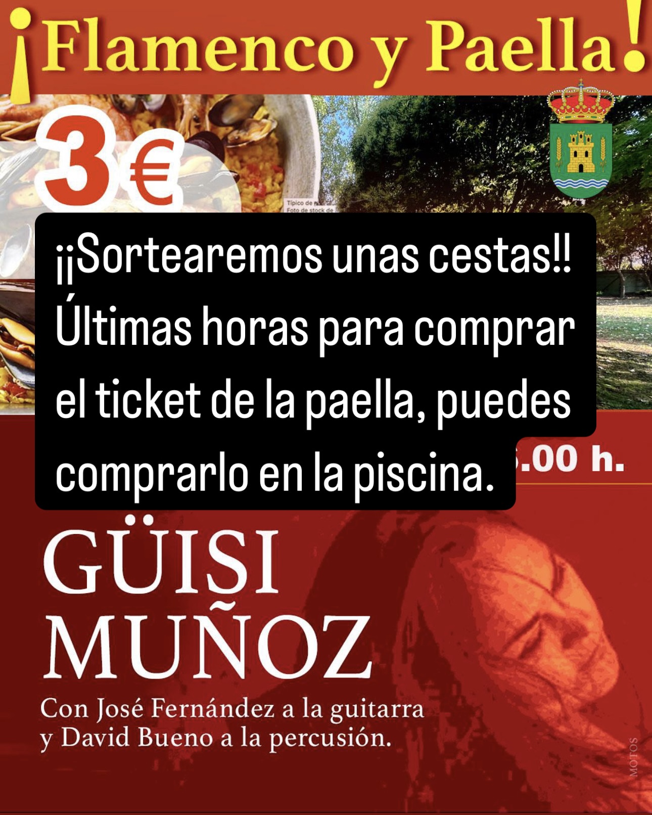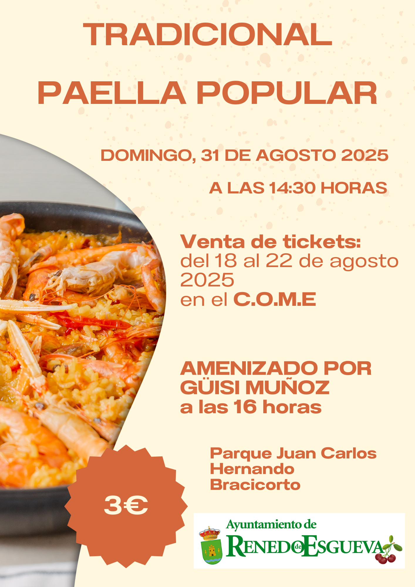 ¡Os recordamos que el domingo 31 de agosto tenemos la tradicional paella popular que estará amenizada por Güisi Muñoz!
